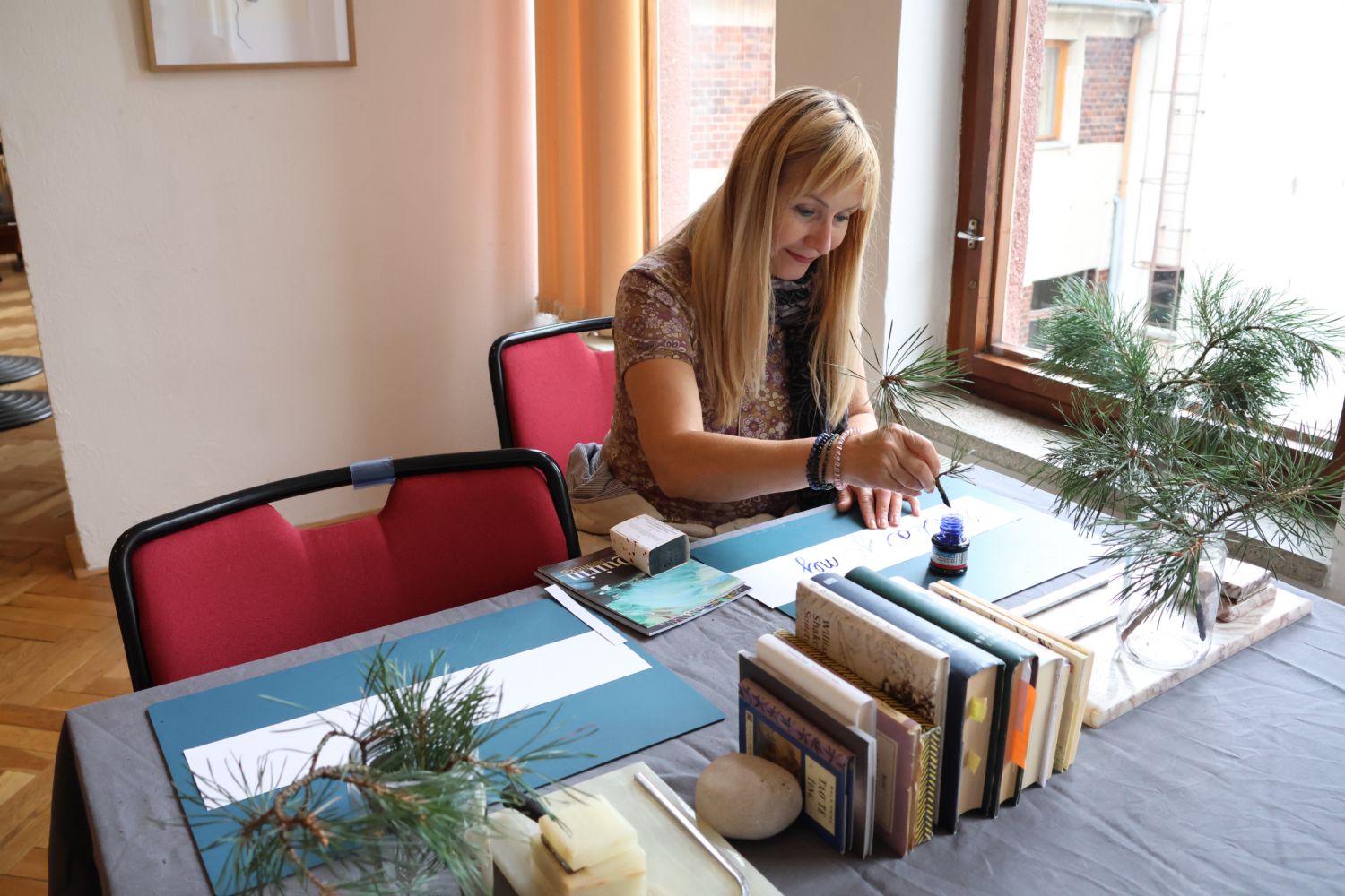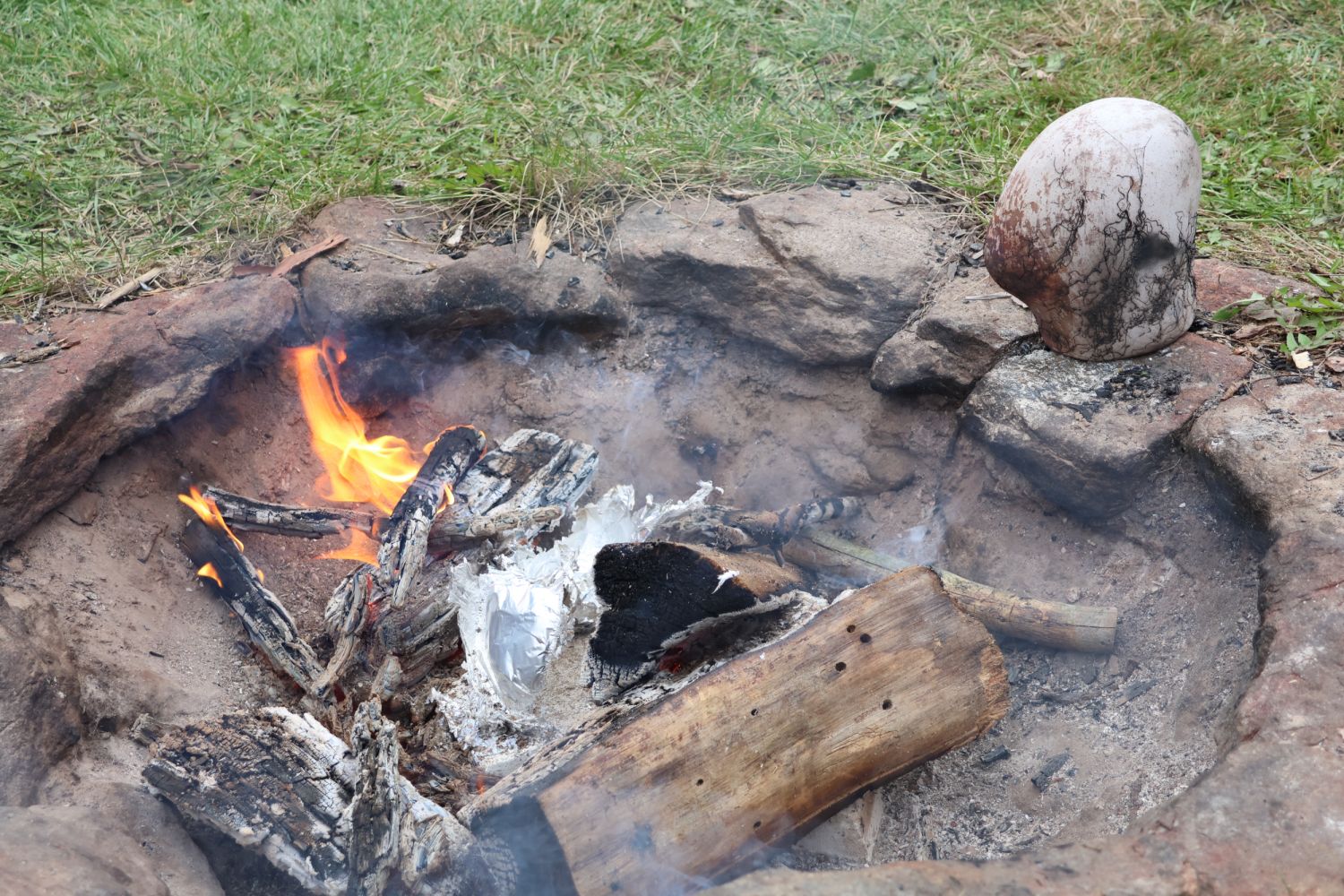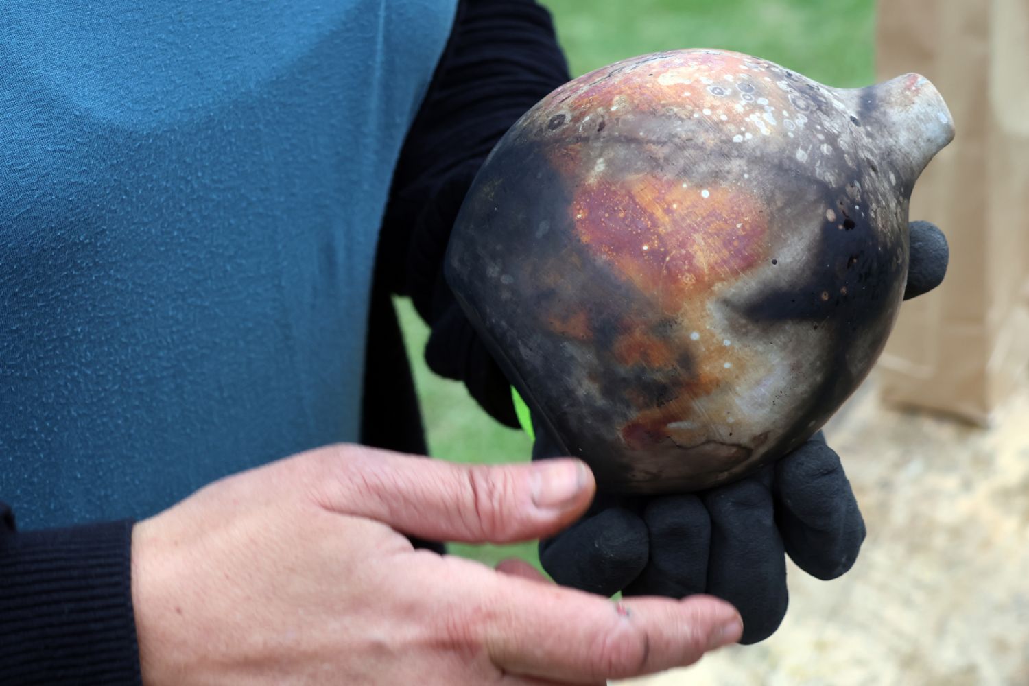 To nad statkem v Radostíně nad Oslavou se neustále vznášela oblaka dýmu. Jana Mikysková tu totiž předváděla přírodní výpaly keramiky. Kouřilo se nejen z ohniště na dvoře, ale také z několika sudů, kde doutnaly piliny či šlehaly plameny, zatímco výtvarnice představovala početné skupině přihlížejících již hotové kousky. „Tady ty černé tečky vznikly po posypání výrobku cukrem, tyhle jsou od soli a tady ty vzory vytvořily koňské žíně,“ vysvětlovala různé techniky jako třeba raku či zakuřování v pilinách. „Přírodní výpaly ovlivňuje tolik věcí, že výsledek je pro mě vždycky překvapením, a to se mi na tom líbí,“ dodala.