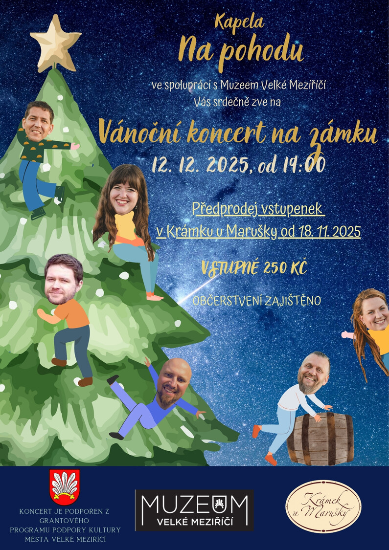 Předvánoční rozjímání plné podmanivých melodií přinese na zámek kapela Na pohodu. Ta se po loňském úspěchu rozhodla uspořádat koncert opět ve vnitřních prostorách zámku, a to v pátek 12. prosince od 19 hodin. „Repertoár bude hodně různorodý, aby si každý přišel na své. Připravili jsme si i novou písničku, kterou si posluchači zazpívají spolu s námi,“ láká diváky zpěvačka Aneta Kapčuková. A chybět nebude ani občerstvení.