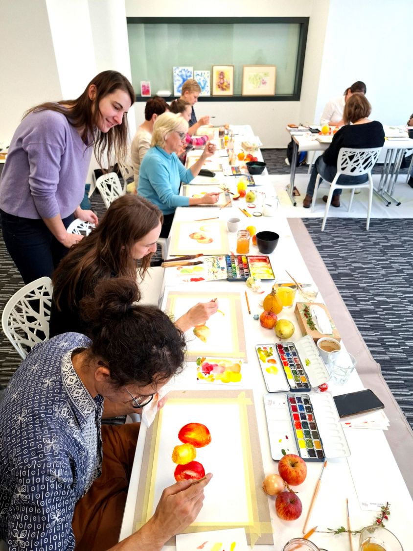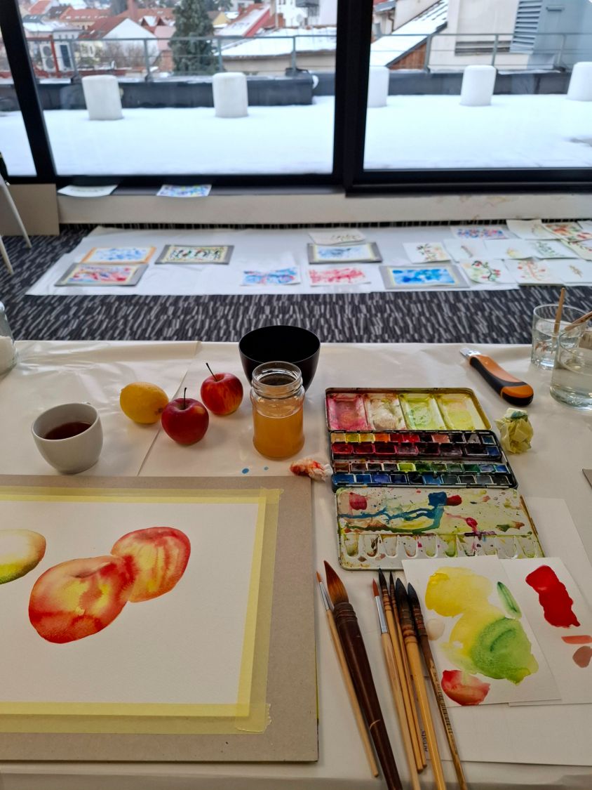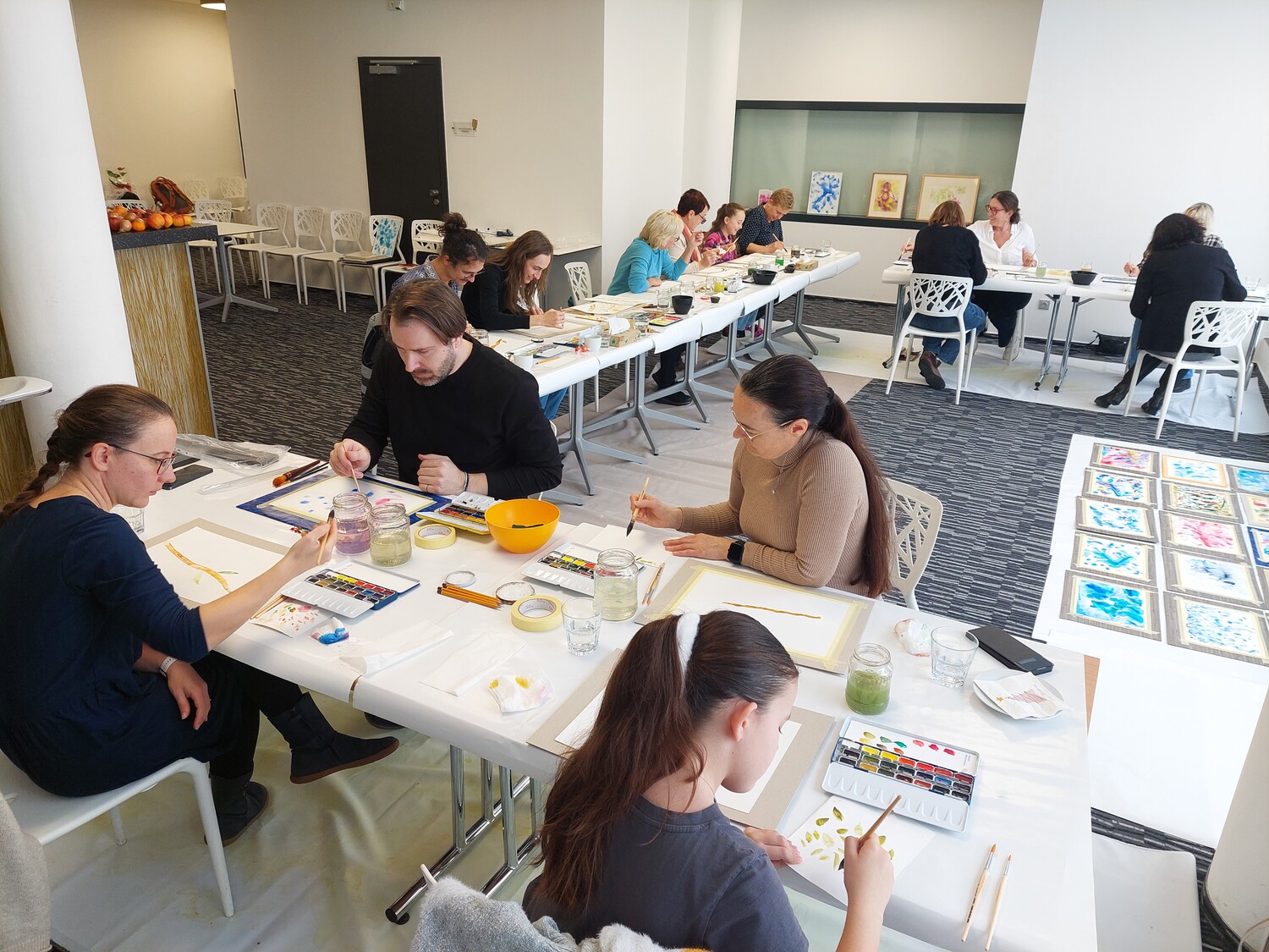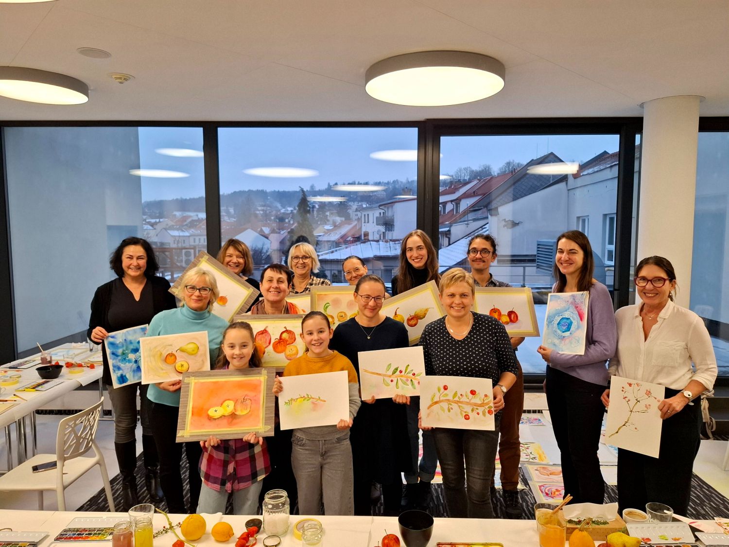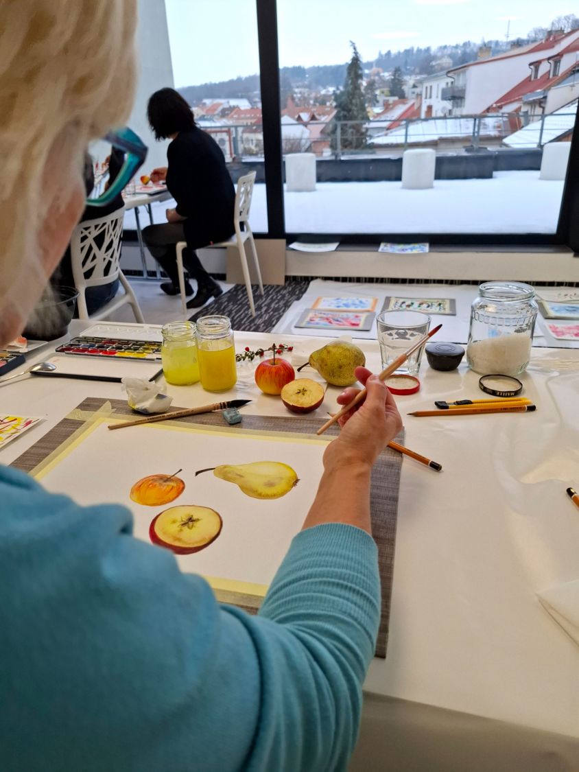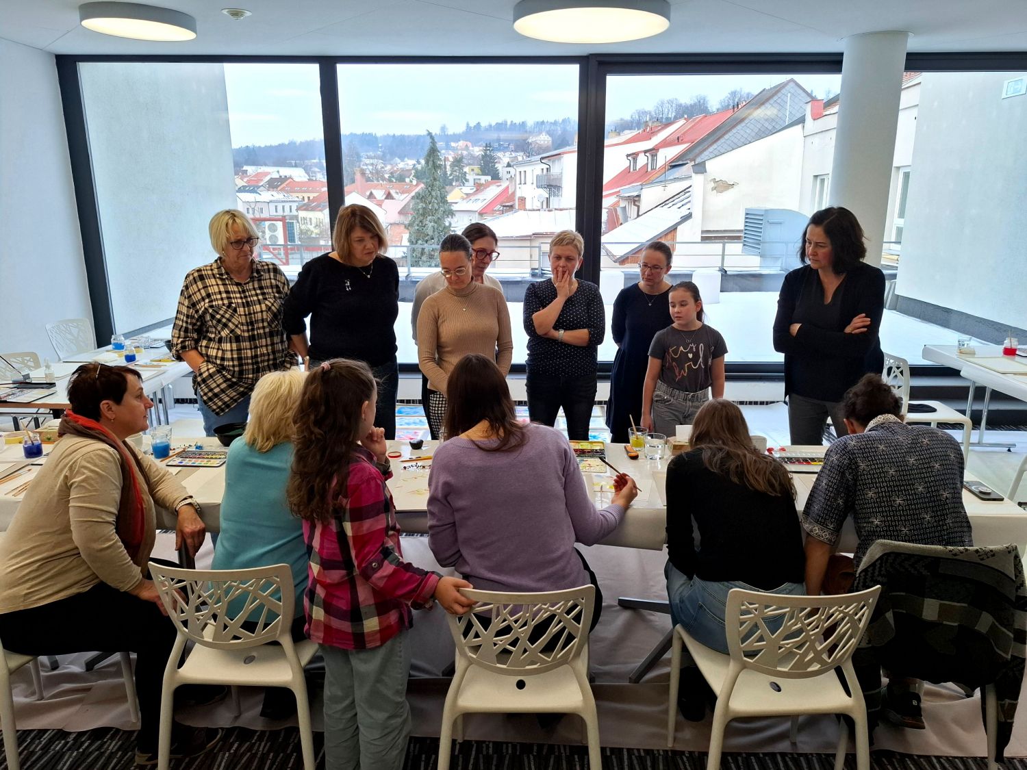 Třináct začínajících i pokročilých malířek a malířů se sešlo při workshopu akvarelové malby, který proběhl 29. listopadu v salónku Jupiter clubu. Vedla ho zkušená lektorka Eva Pejchalová.