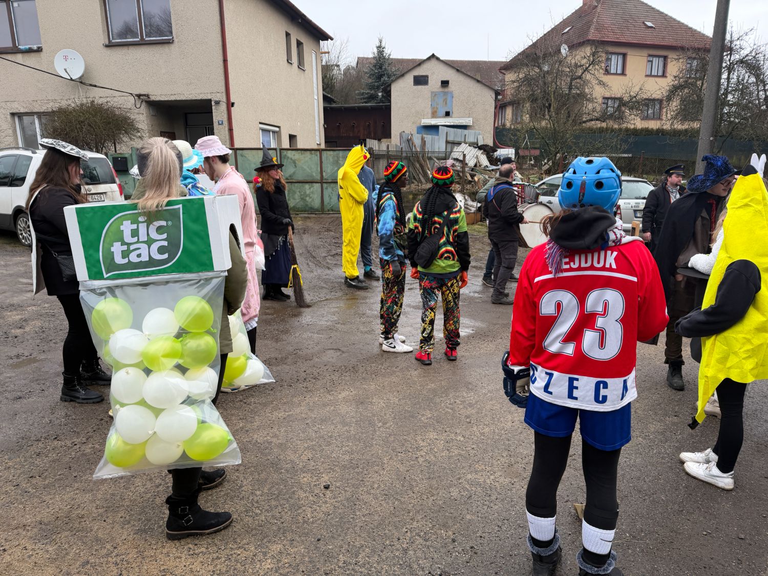 Masopustní průvod Mostištích vedli rádcové X a Y z pohádky Šílené smutná princezna, které následovali Jamajčani, solnička a pepřenka, bonbóny Tic Tac, banány, čarodejnice, medvěd, pokémoni a mnoho dalších.