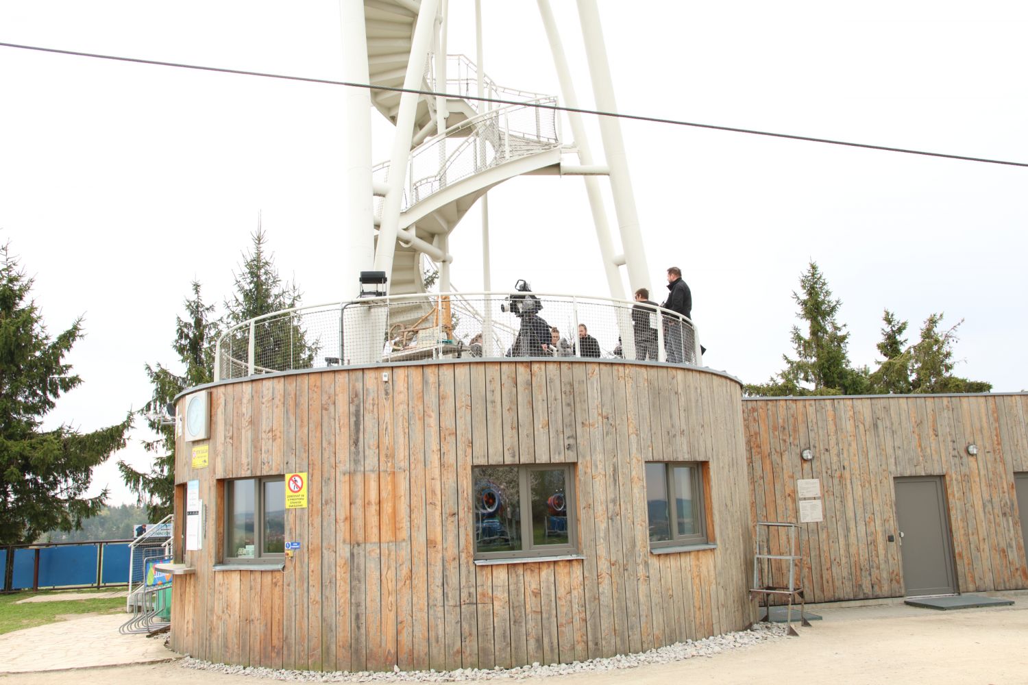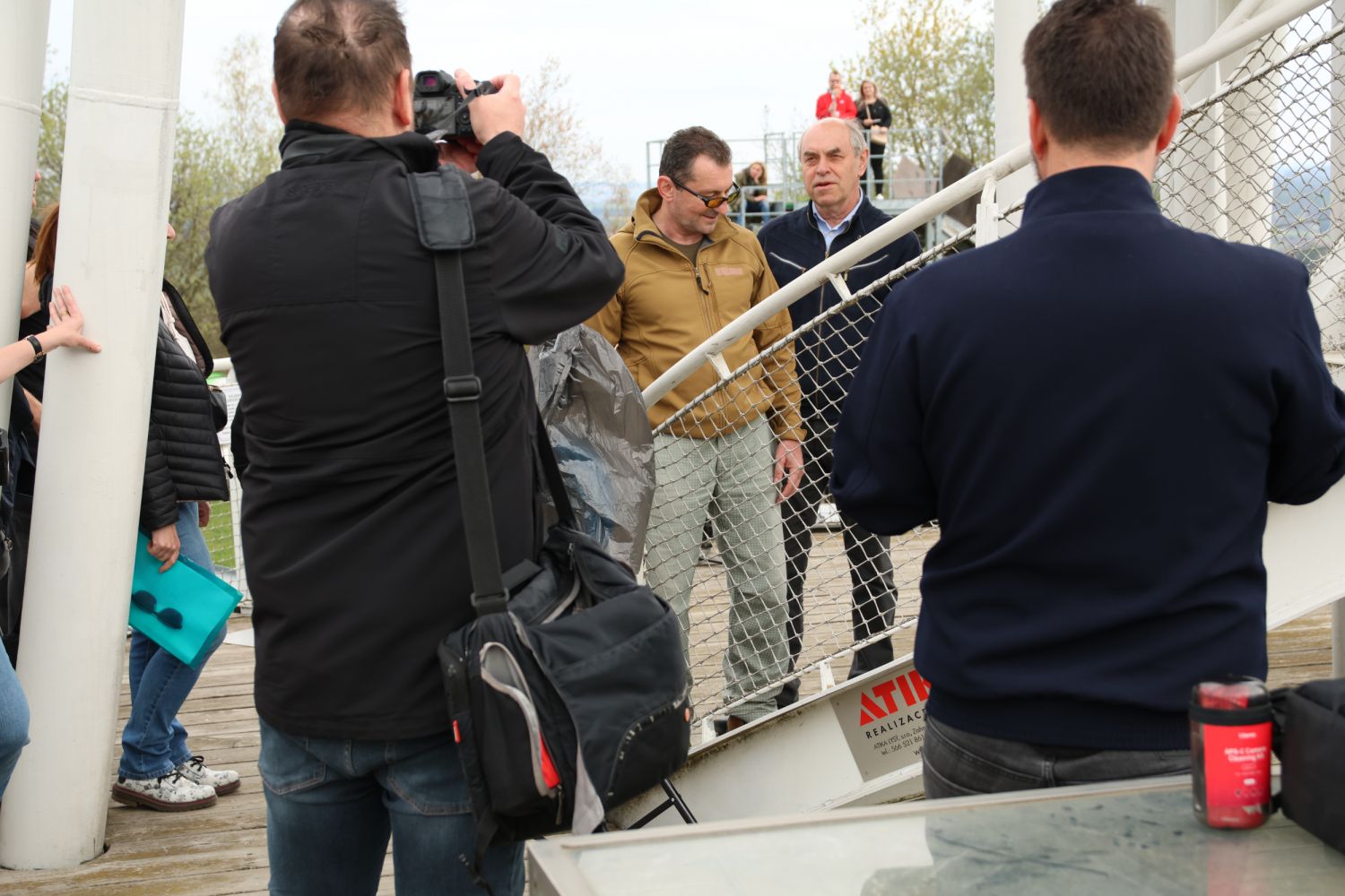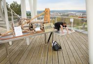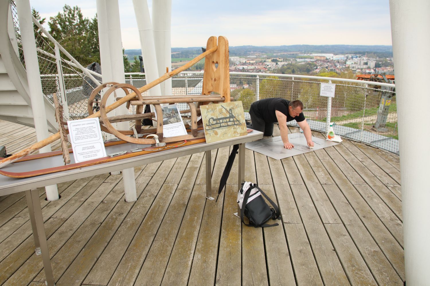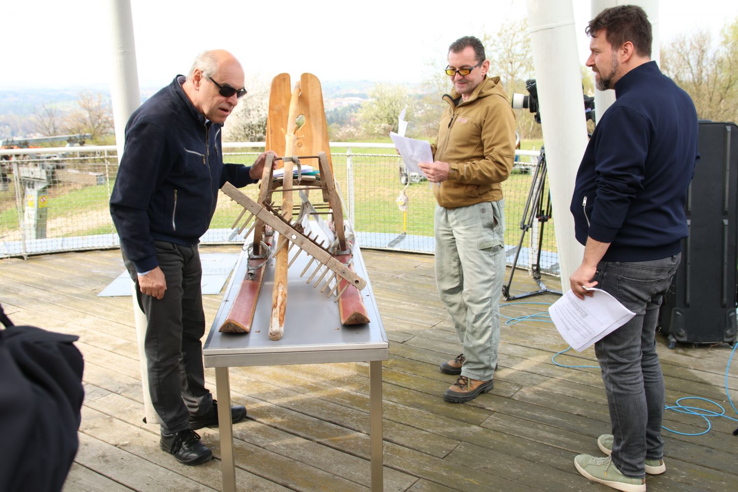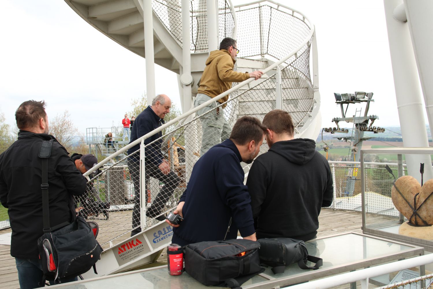 Miroslav Táborský s Ondřejem Vetchým vystoupali i na rozhlednu a pokochali se výhledem do širokého dalekého okolí. A pak se už oba herci naplno věnovali nedostižitelným vynálezům Járy Cimrmana.