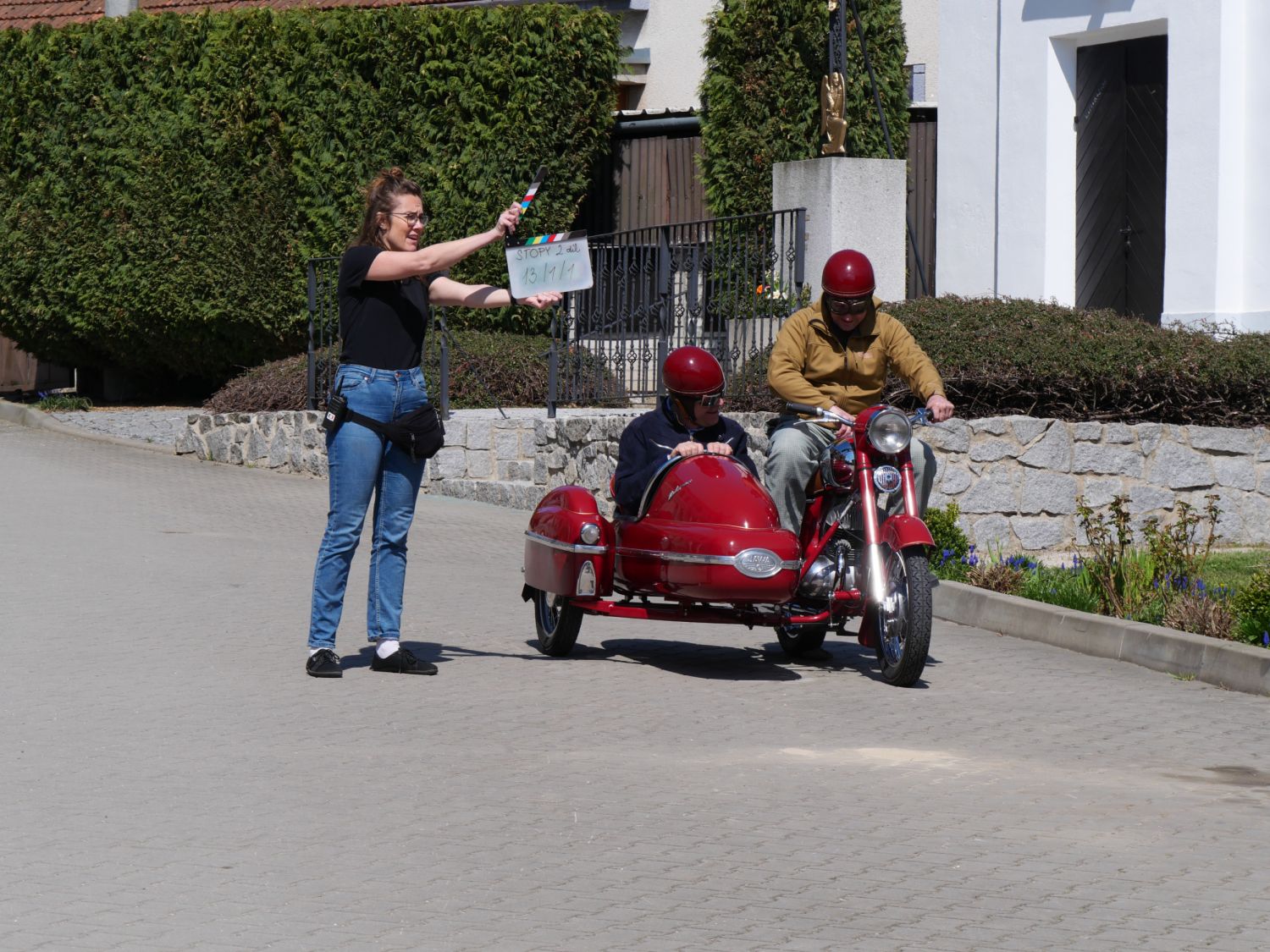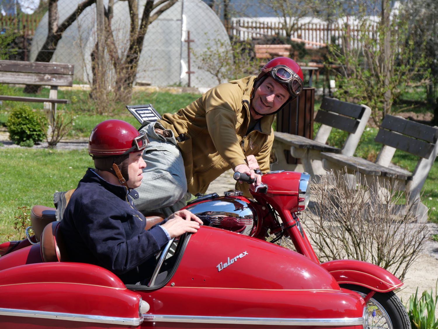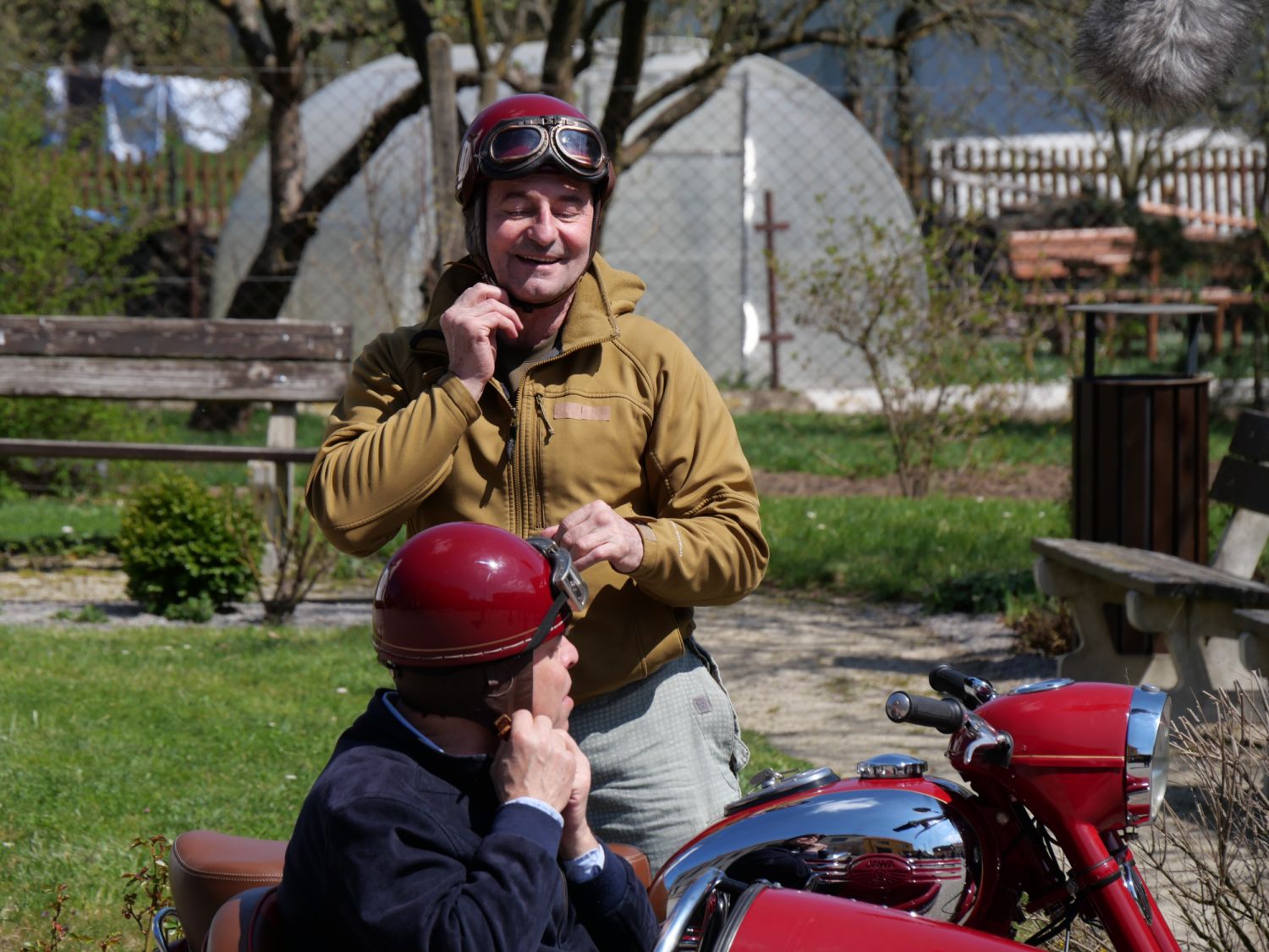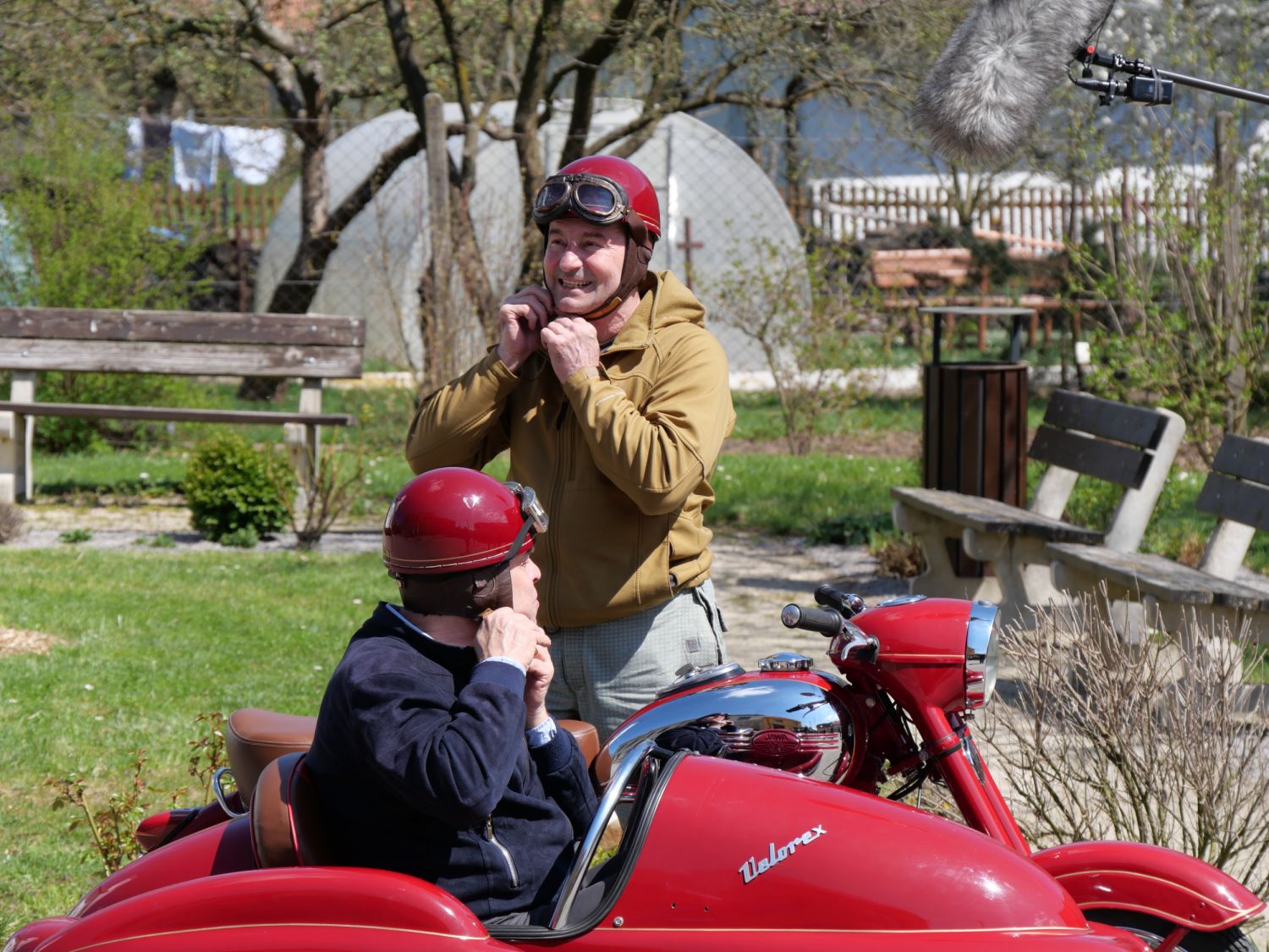 V sobotu se za krásného jarního počasí točil příjezd průvodce seriálem Miroslava Táborského a jeho doprovodu v podobě herce Ondřeje Vetchého do Vídně. Miroslav Táborský v sajdě a Ondřej Vetchý za řídítky vymazlené historické Jawy, která byla zapůjčena z nedalekých Rouchovan.