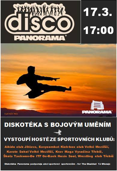 Zveme vás na jedinečnou diskotéku s přehlídkou ukázek bojových sportů aikido, kick-box, karate, krav maga, taekwon-do a wrestling.