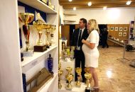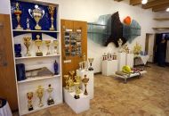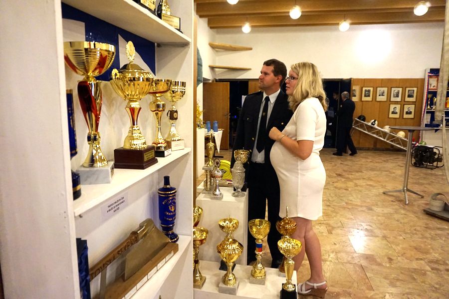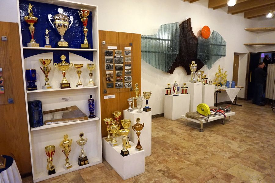Výstavě dominuje stěna s trofejemi z hasičských soutěží.