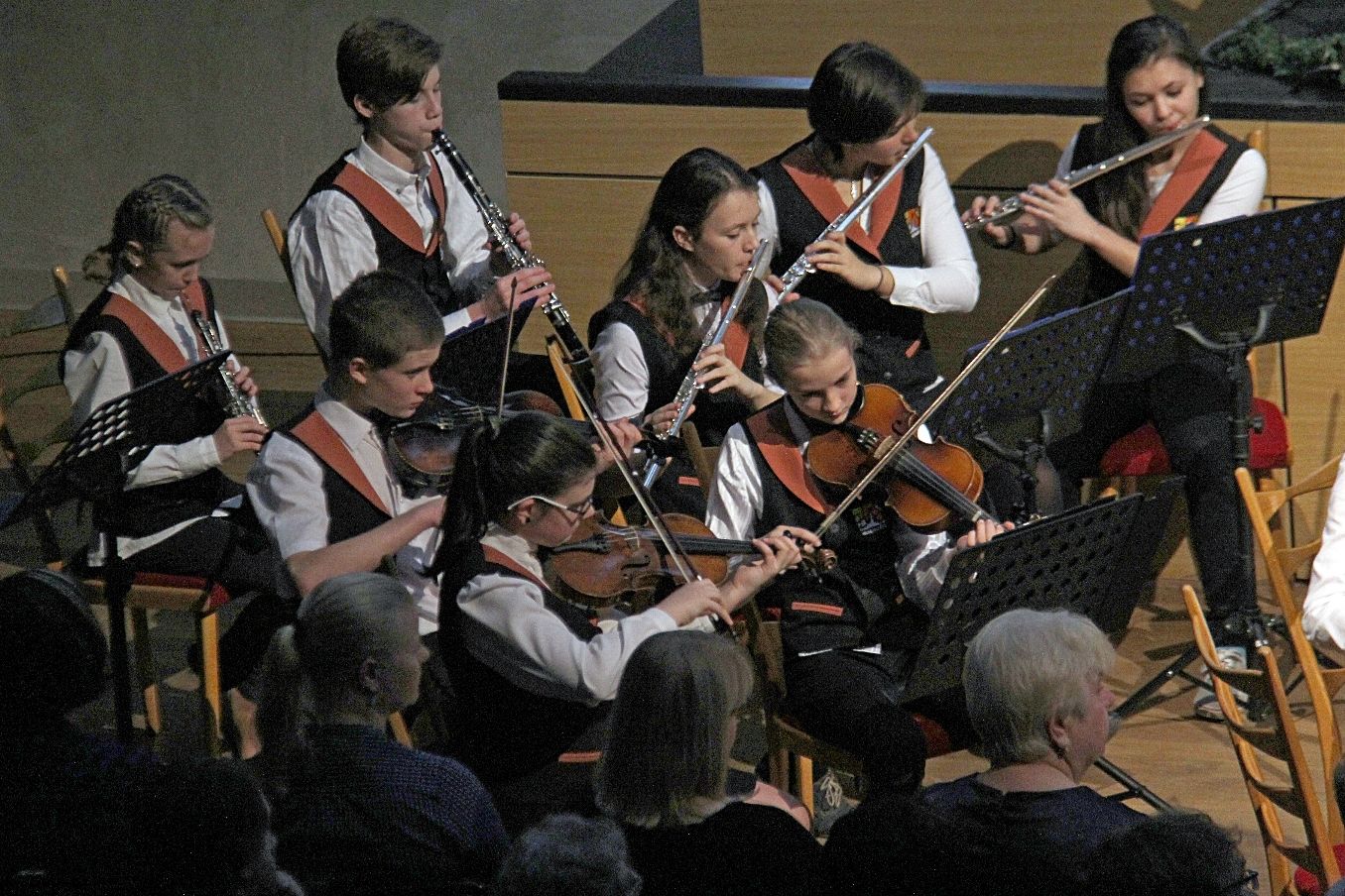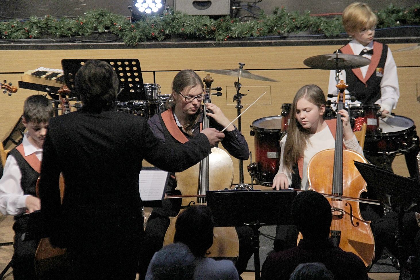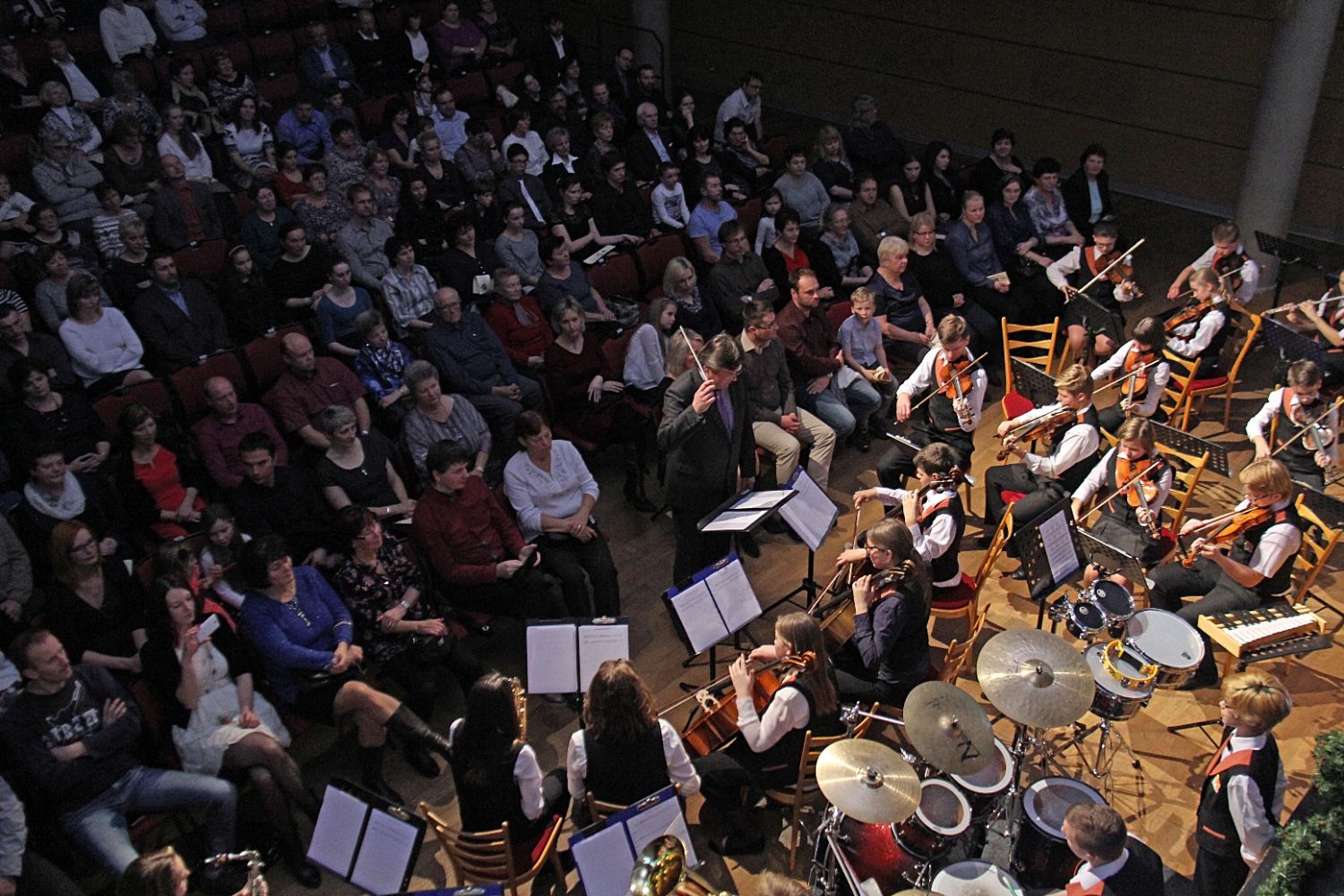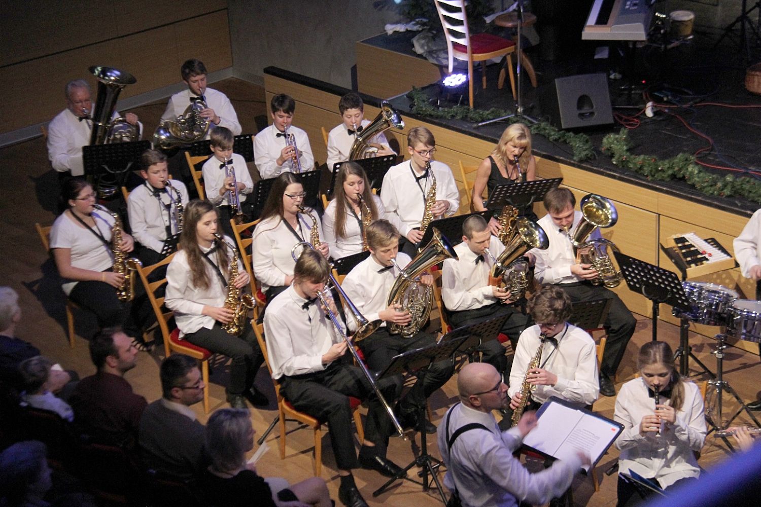 Po přestávce už patřil program výhradně základní umělecké škole. Nastoupilo něžné dechové trio vedené Klárou Kostelníkovou. A hned za nimi pěvecké sbory Andantino a Andante Heleny Valové. Ty bylo vidět na pódiu v podstatě až do samého konce pořadu, neboť spoluúčinkovaly i se Smíšeným orchestrem ZUŠ, který pod taktovkou Martina Karáska koncert uzavíral. Zazněly i skladby F. Sinatry May Way či M. Jacksona Heal The World. A ve finále tradiční koleda Narodil se Kristus Pán. Těsně před ní i s oběma moderátory programu Adélou Ubrovou a Jakubem Karbanem připil přítomným na zdraví Milan Dufek, který se s posluchači s přáním krásných Vánoc prožitých v kruhu rodinném rozloučil.