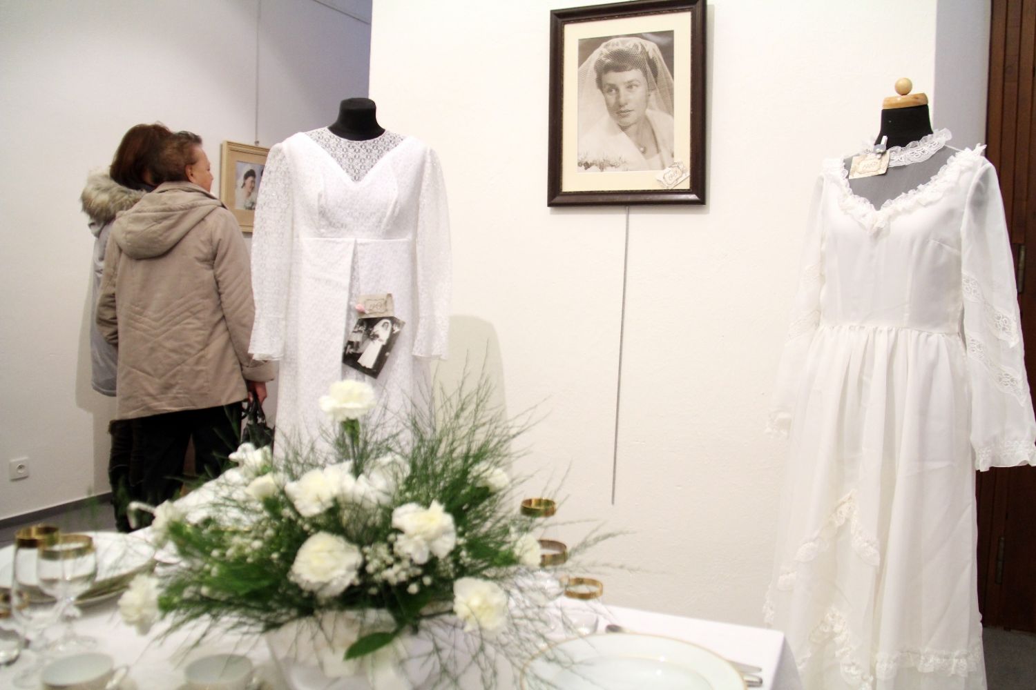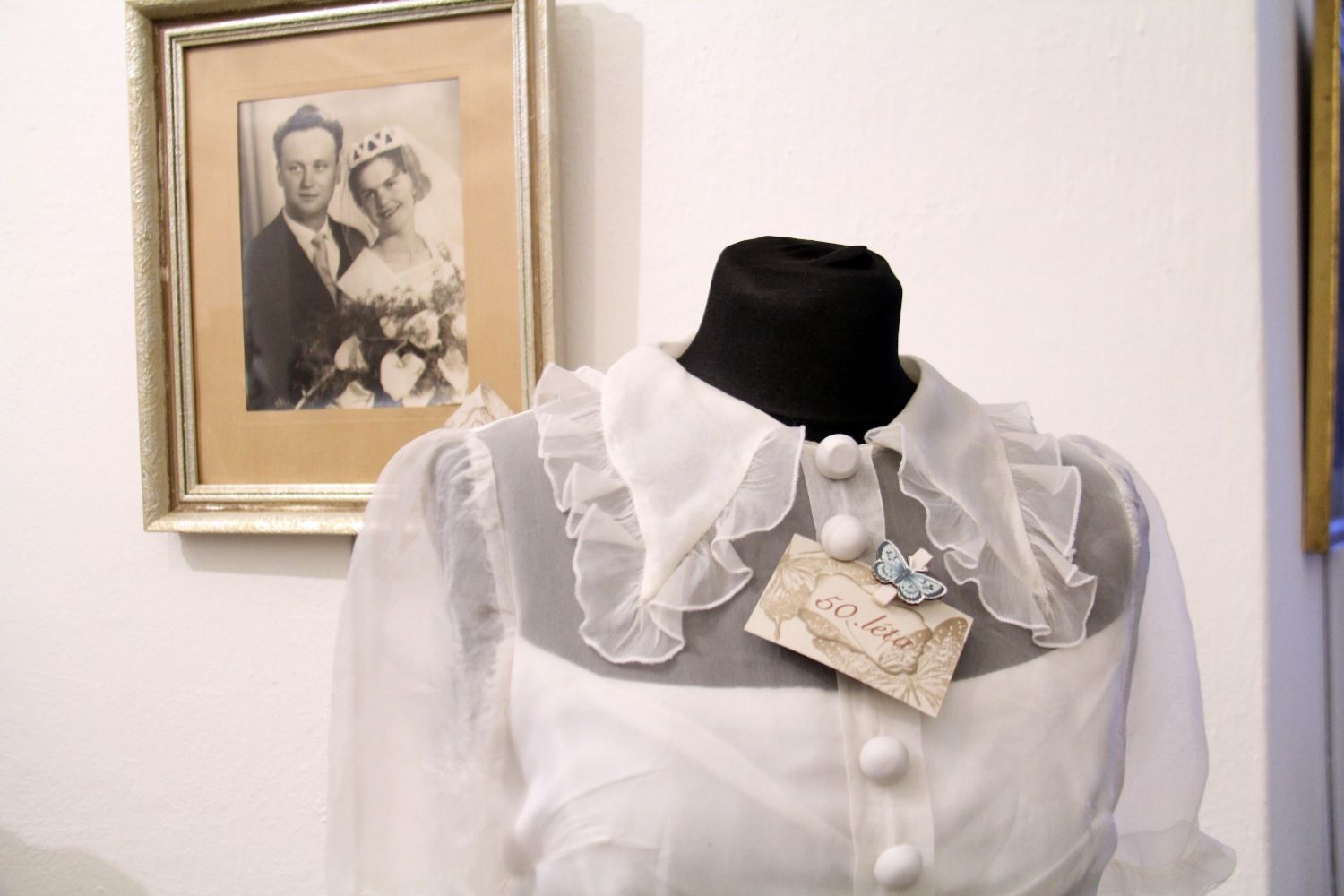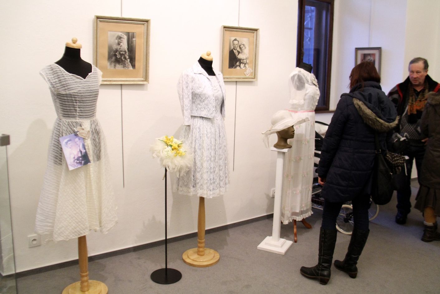 „Čtyřiadvacátý model má na sobě majitelka sbírky a spoluautorka výstavy Nikola Melicharová,“ uvedla při včerejší vernisáži ředitelka muzea Irena Tronečková a přivítala hosty. Nikola Melicharová z Petrůvek na Hrotovicku pak představila svoji sbírku. „Nejstarší model, který mám, je z roku 1946. Celkem vlastním asi sto dvacet šatů a k nim nepočítaně doplňků,“ uvedla sběratelka. Na výstavě jsou k vidění krom dámských šatů i pánské obleky a doplňky jako rukavičky, závoje, kloboučky, kabelky, šperky, svatební oznámení, kytice, dorty a další. K jednotlivým kusům jsou často připojeny i fotografie ženicha a nevěsty. „Vždy se snažím shromáždit z jedné svatby co nejvíc kousků, abych měla ucelenou kolekci. Nejčastěji nakupuji přes inzeráty, občas mi někdo něco věnuje. Paradoxně nejčastěji lidé, kteří jsou rozvedení nebo se právě rozvádějí,“ dodala.