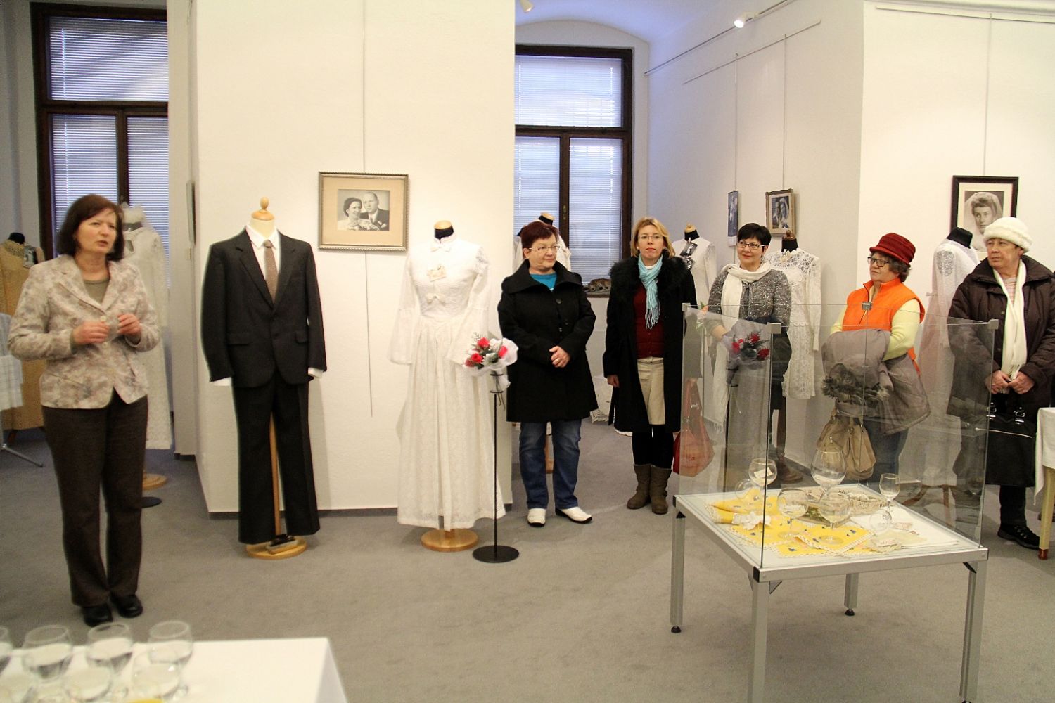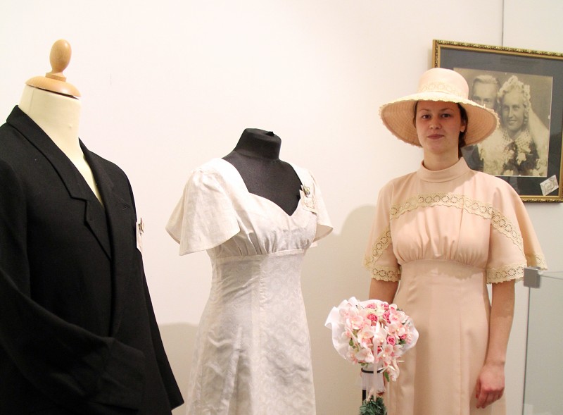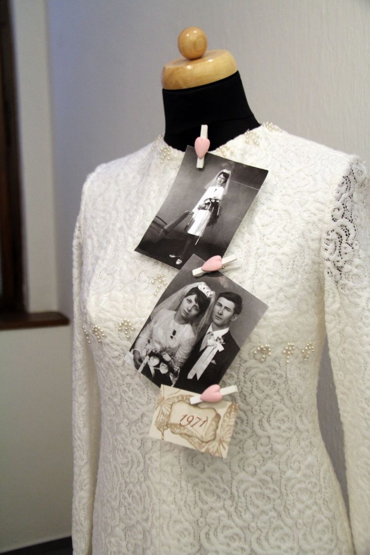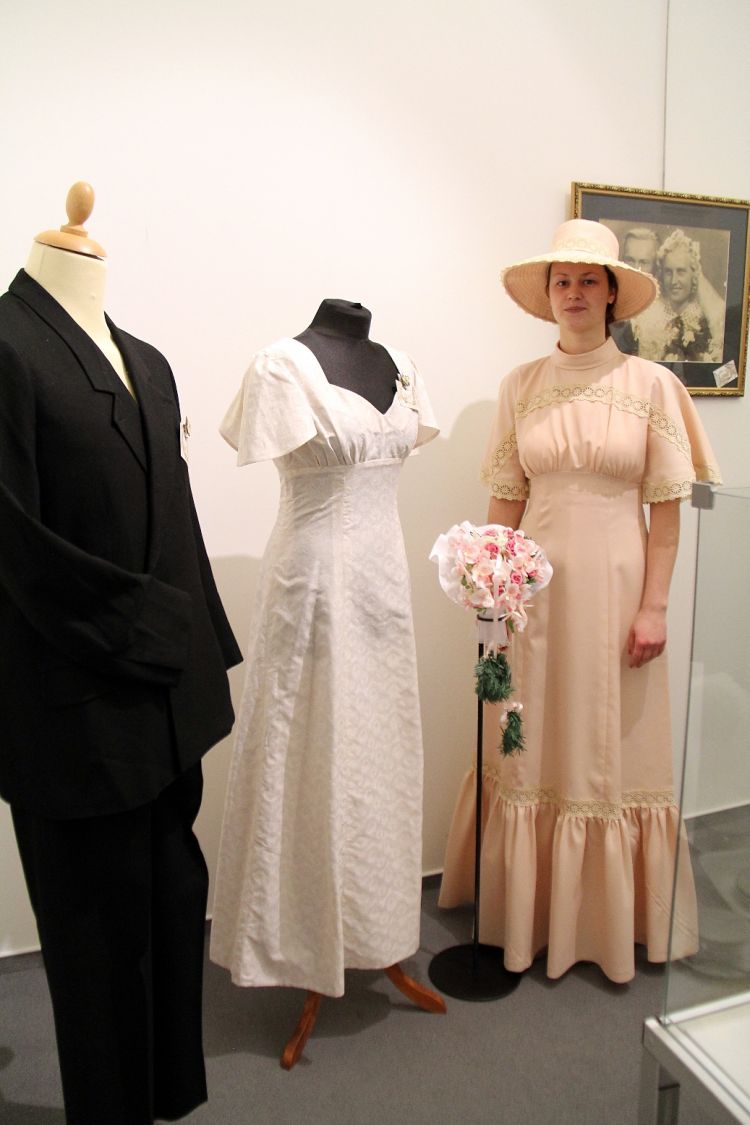 „Čtyřiadvacátý model má na sobě majitelka sbírky a spoluautorka výstavy Nikola Melicharová,“ uvedla při včerejší vernisáži ředitelka muzea Irena Tronečková a přivítala hosty. Nikola Melicharová z Petrůvek na Hrotovicku pak představila svoji sbírku. „Nejstarší model, který mám, je z roku 1946. Celkem vlastním asi sto dvacet šatů a k nim nepočítaně doplňků,“ uvedla sběratelka. Na výstavě jsou k vidění krom dámských šatů i pánské obleky a doplňky jako rukavičky, závoje, kloboučky, kabelky, šperky, svatební oznámení, kytice, dorty a další. K jednotlivým kusům jsou často připojeny i fotografie ženicha a nevěsty. „Vždy se snažím shromáždit z jedné svatby co nejvíc kousků, abych měla ucelenou kolekci. Nejčastěji nakupuji přes inzeráty, občas mi někdo něco věnuje. Paradoxně nejčastěji lidé, kteří jsou rozvedení nebo se právě rozvádějí,“ dodala.