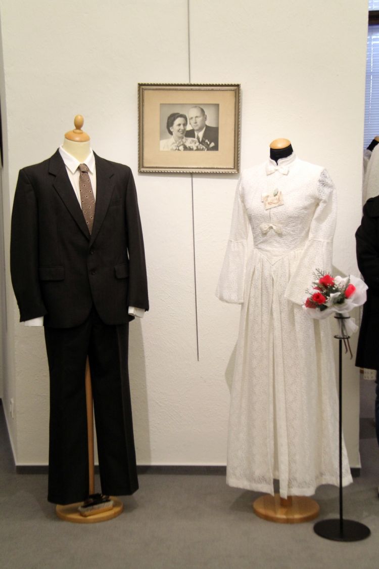 Většina dámských šatů na výstavě je v bílé či světlé barvě. Tak je to zvykem i dnes. „Ve středověku tomu tak nebylo,“ dozvěděli se návštěvníci vernisáže od historičky Marie Ripperové, „bílá byla znamením smutku a vlastně byla i nejlevnější, neboť barvení látky stálo peníze." Ve středověku se šily šaty v různých výrazných barvách, hlavně v modré, růžové, tmavočervené a z materiálu jako hedvábí nebo samet – to u bohatých vrstev. Šaty tak nepostrádaly ani zdobení a zlato. Chudší lidé šili z levnějších materiálů, ale snažili se napodobovat trend. „No a ti, co si ani to nemohli dovolit, byli rádi, že mají vůbec nějaké šaty, takže to neřešili,“ podotkla Ripperová. Bílé šaty pro nevěstu tak prorazily až v polovině devatenáctého století, také díky svatbě anglické královny Viktorie, která se vdávala právě v bílém.