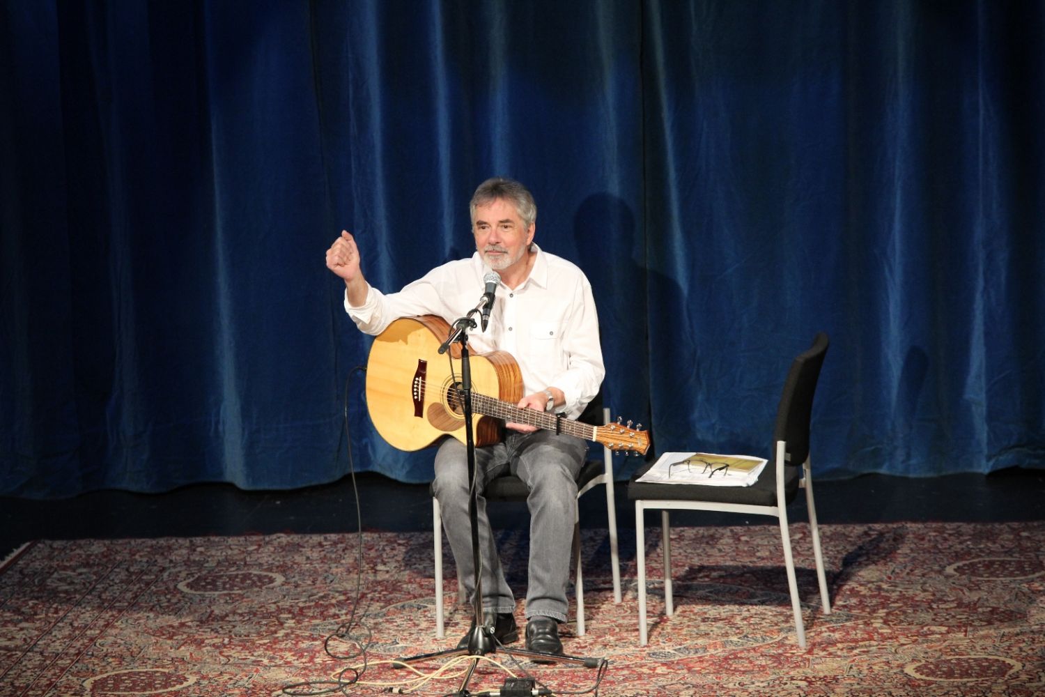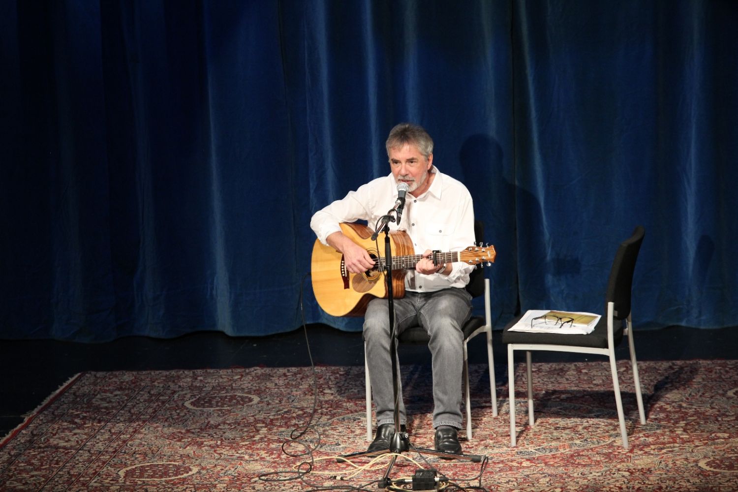 „Vycházím z toho, že humor a smích jsou kořením života a každý se rád zasměje neštěstí druhých,“ uvedl svůj pořad Soudničky aneb Zpod taláru. Některé z příběhů jeho fanoušci znali, další byly novějšího data. Písničky prokládal zajímavými zápisy ze soudních spisů, policejních protokolů a dalších úředních dokumentů. Vybral kuriózní případy, v nichž hlavní roli sehrála zvířata. Třeba tu o medvědovi na mopedu či o divokém praseti na lyžích. Neopomněl ani partnerské a sousedské vztahy, přidal i několik historek o myslivcích. „O jmenovaném je v obci známo, že je to podivín, ale to, že použitím slzného plynu přinutil účastníky honu plakat nad padlou zvěřinou, považujeme za promyšlený čin,“ přečetl například zprávu, která přišla k soudu na jednoho občana, jenž asi zrovna nebyl velkým fandou myslivosti.
