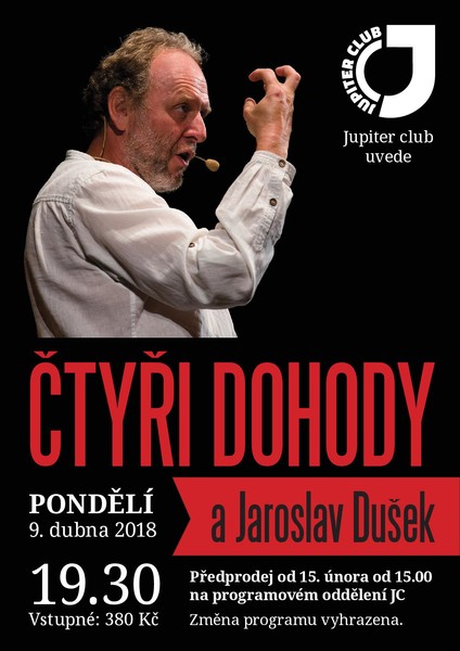V pondělí 9. dubna v 19:30 uvede Jupiter club Jaroslava Duška s představením Čtyři dohody. Vstupenky se budou v předprodeji prodávat od čtvrtka 15. února od 15.00 na programovém oddělení Jupiter clubu.