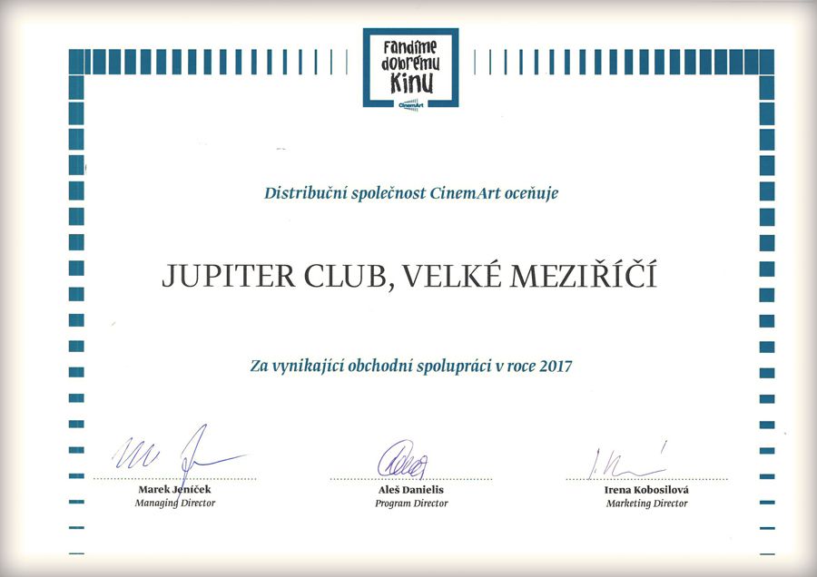 Velkomeziříčské kino získalo od společnosti CinemArt ocenění za vynikající obchodní spolupráci za rok 2017. Jde o prestižní cenu, udělovanou každoročně jednomu kinu své kategorie na základě počtu diváků, představení a podobných kritérií.