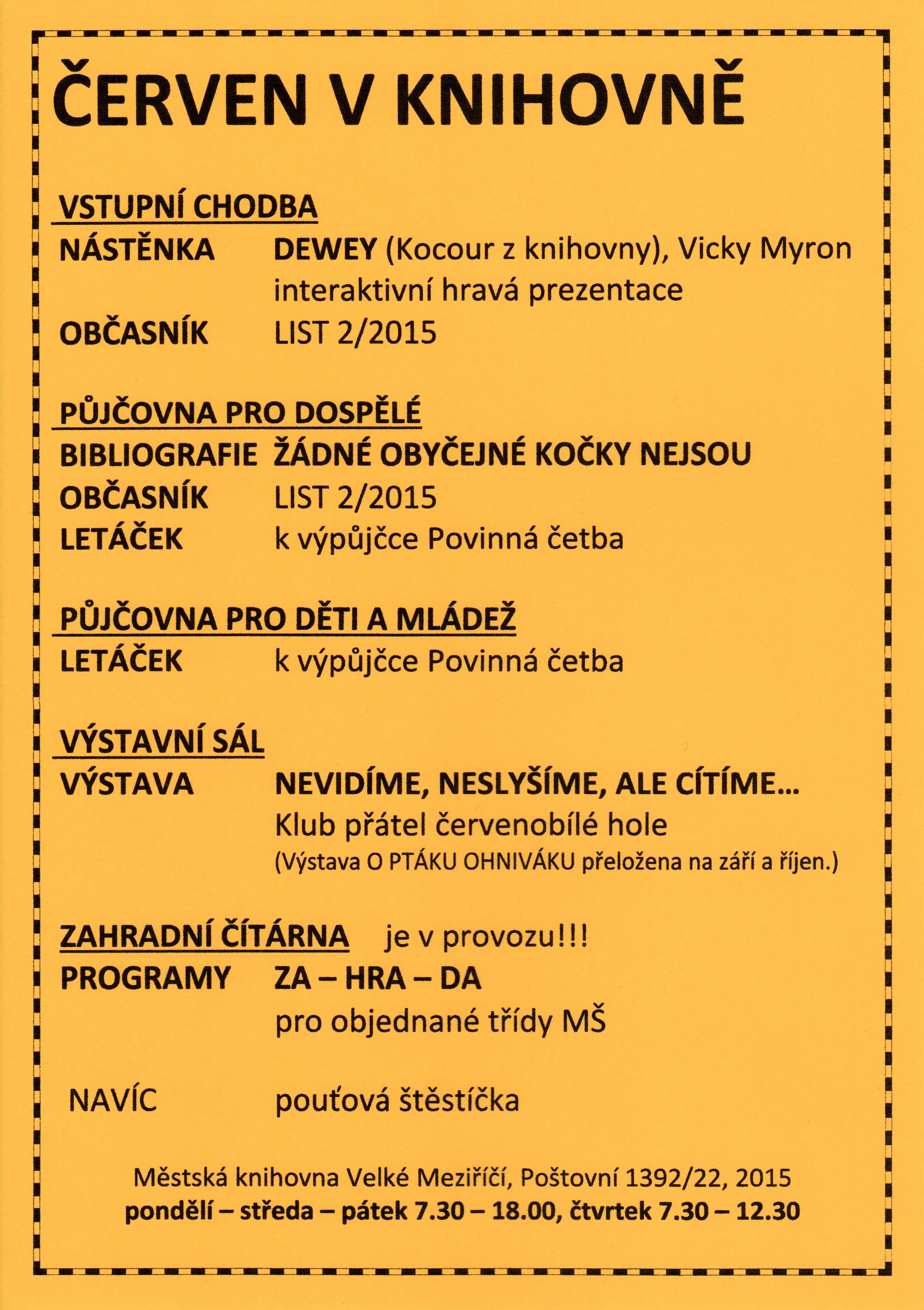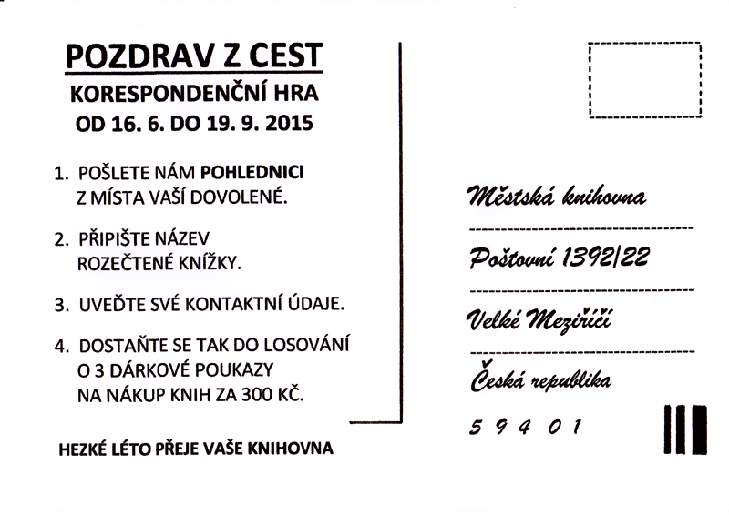 Velkomeziříčská městská knihovna připravila pro čtenáře letní korespondenční hru Pozdrav z cest. Každý, kdo od 16. června do 19. září pošle na adresu knihovny pohlednici ze své dovolené, připíše název rozečtené knížky a uvede také své kontaktní údaje, se může dostat do losování o tři dárkové poukazy na nákup knih v hodnotě 300 korun.