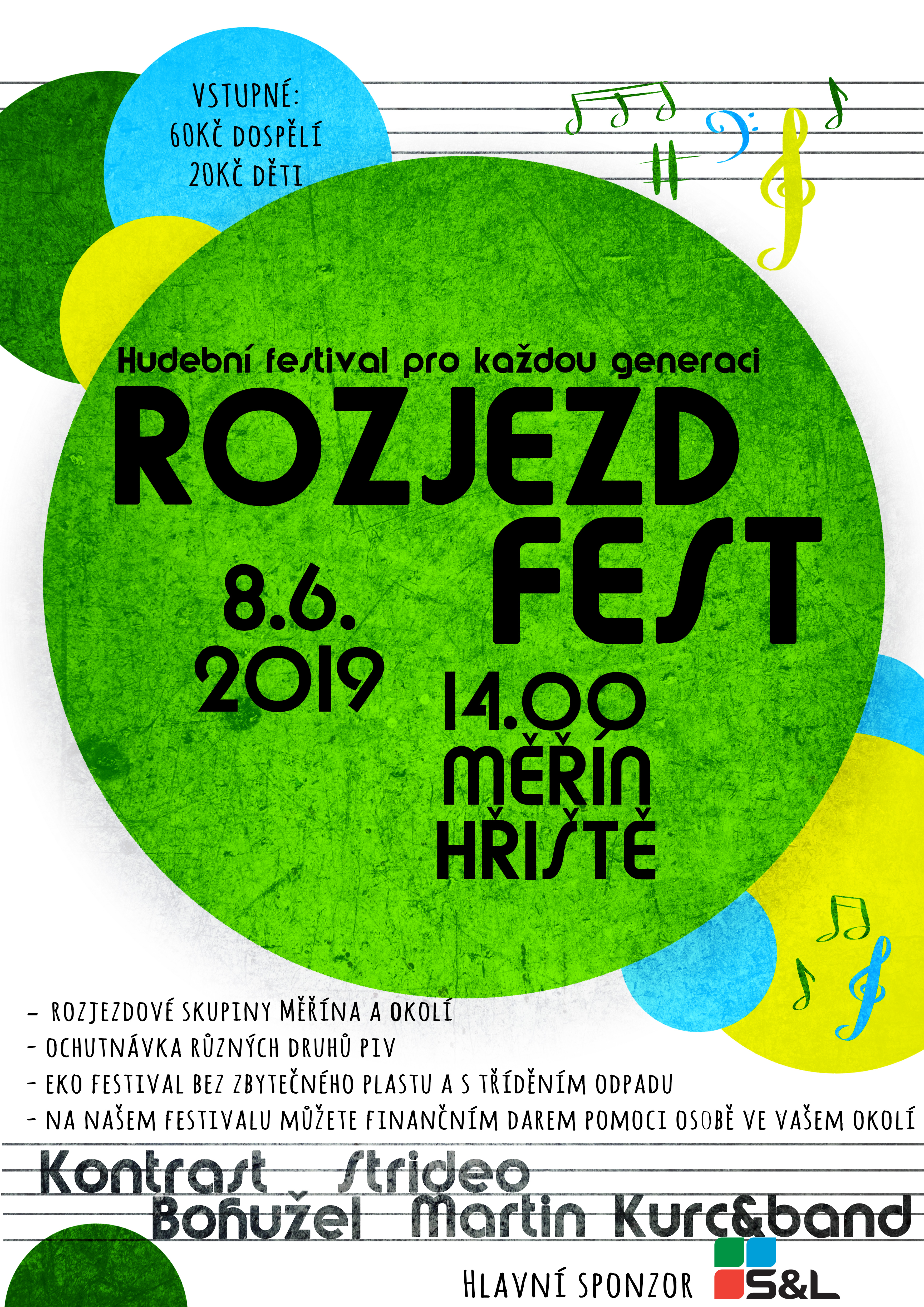 Hudební festival Rozjezd Fest je zaměřen na mladé kapely z Měřína a blízkého i vzdáleného okolí. Celá akce ale nebude jenom o příjemné hudbě a talentovaných lidech, ale také o dobrém jídle, setkání se sousedy, radosti pro děti a dobrých úmyslech v podobě charitativní pomoci člověku z našeho okolí. Dobrou zprávu máme taky pro „eko nadšence" – na našem festivalu budeme třídit odpad a používat co nejméně plastu.