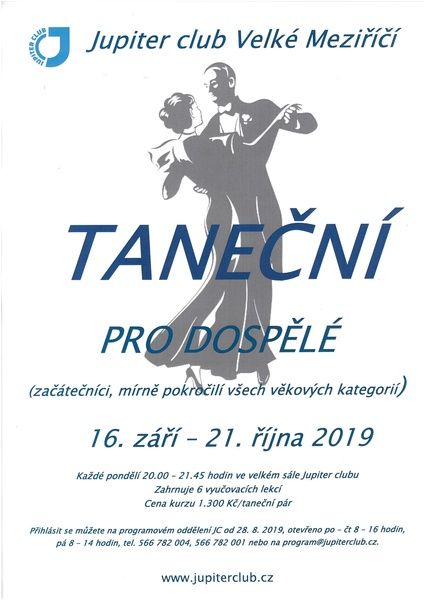 Zahájení proběhne 16. září 2019 a ukončení 21. října 2019. Zahrnuje 6 tanečních lekcí. Kurzy jsou určeny pro začátečníky a mírně pokročilé všech věkových kategorií. Informace získáte na programovém oddělení Jupiter clubu.