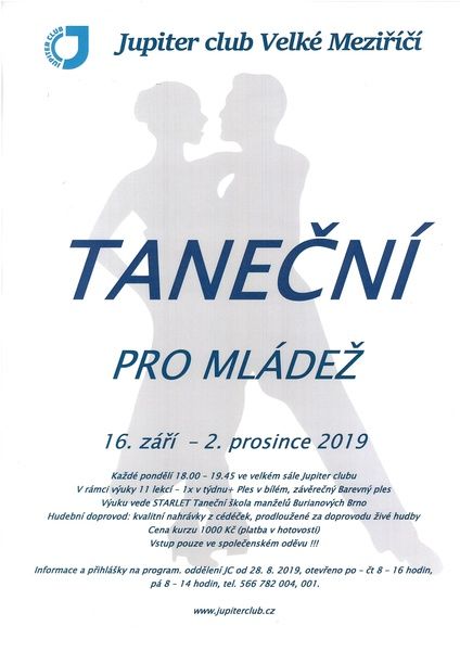 Zahájení proběhne 16. září 2019 a ukončení v prosinci 2019. V rámci výuky bude 11 lekcí vždy v pondělí. Uzávěrka přihlášek je do 13. 9. 2019. Výuku vede Taneční škola STARLET Brno paní Buryanová. Více informací na programovém oddělení Jupiter clubu.