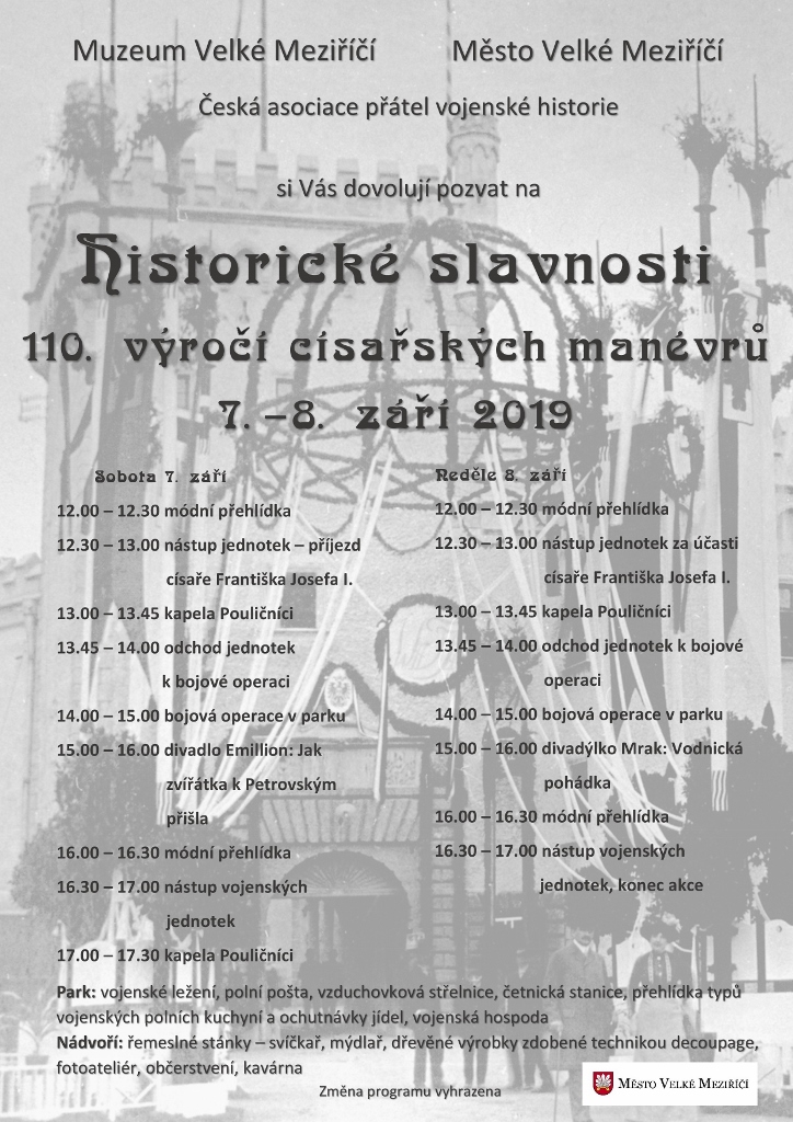 Velkomeziříčský zámek se o víkendu pomyslně přenese do roku 1909, kdy se v okolí Velkého Meziříčí konaly císařské manévry. Návštěvníci se mohou těšit nejen na přítomnost císaře Františka Josefa I., ale také na bohatý program, který je na oba dva dny připraven.