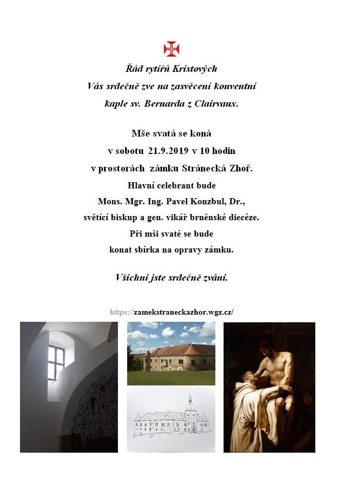 V opravovaném zámečku ve Stránecké Zhoři, který před dvaceti lety koupil jako ruinu Řád rytířů Kristových, bude 21. září vysvěcená opravená kaple. Zasvěcená bude svatému Bernardu z Clairvaux. Na slavnost jsou pozvaní i členové řádu z Německa, řekl ČTK kastelán Miloš Doležal. Kaple je v jižním křídle zámku, vedle kapitulní síně s kryptou.