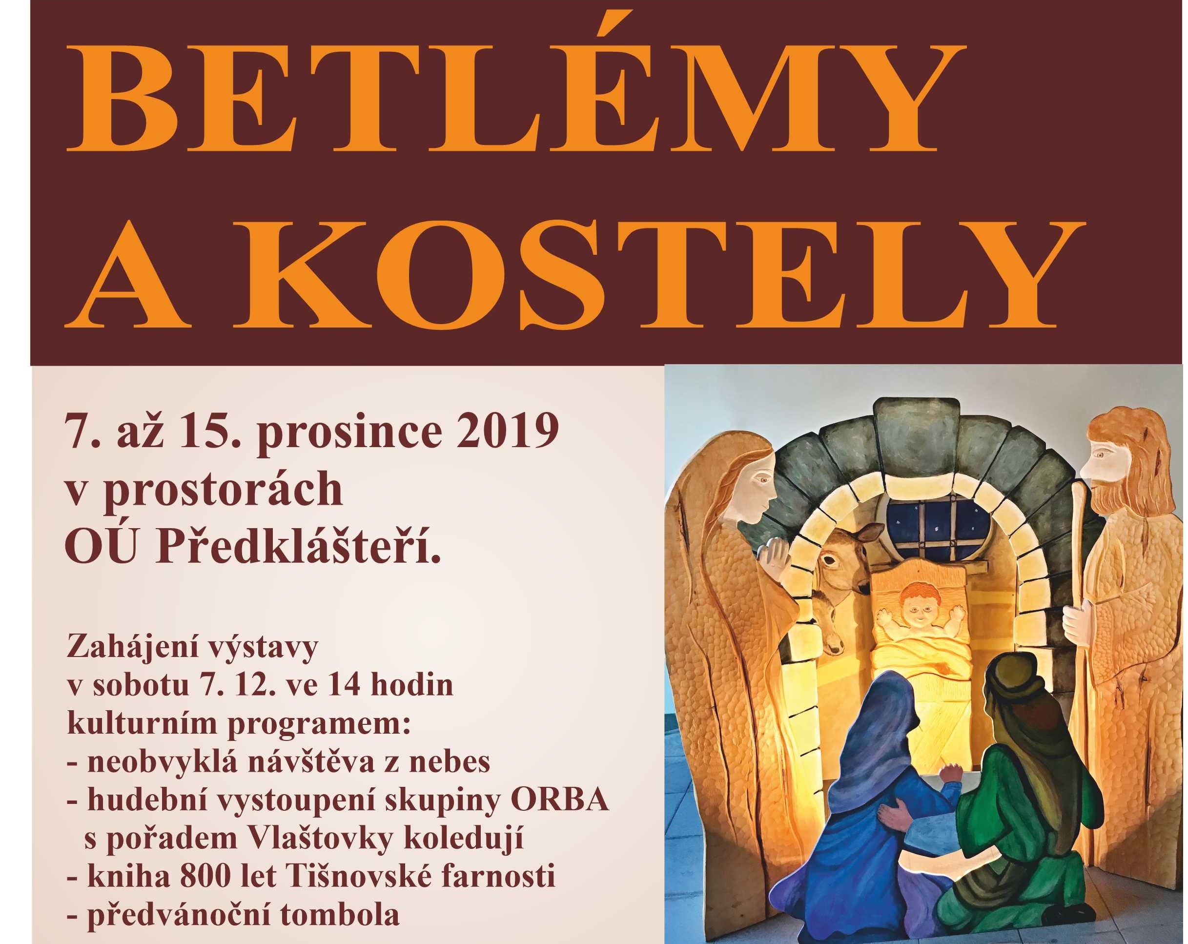 Další výstava z dílny Art Periscope bude ve spolupráci s obcí Předklášteří v prostorách OÚ v termínu 7. - 15. prosince 2019 s názvem „Betlémy a kostely". Dvanáct betlémů z okolních kostelů bude doplněno o díla výtvarníků, která znázorňují, mimo biblický příběh, i symboly kostelů. Poděkování za zapůjčení těchto skvostných exemplářů patří farnostem Tišnov, Předklášteří, Deblín, Křoví, Dolní Loučky, Čebín, Lomnice, Unín, Kuřimská Nová Ves, Nebovidy, dále Domovu sv. Alžběty Žernůvka a za betlém z kaple v Horních Loučkách. Výstavu zahájí v sobotu 7. 12. neobvyklá návštěva z nebes a v hudebním vystoupení se představí skupina ORBA s pořadem Vlaštovky koledují. Derniéru v neděli 15. 12. oživí vystoupení Jiřího Helána s jeho hosty a bude vyhodnocena soutěž dětských výtvarných prací.