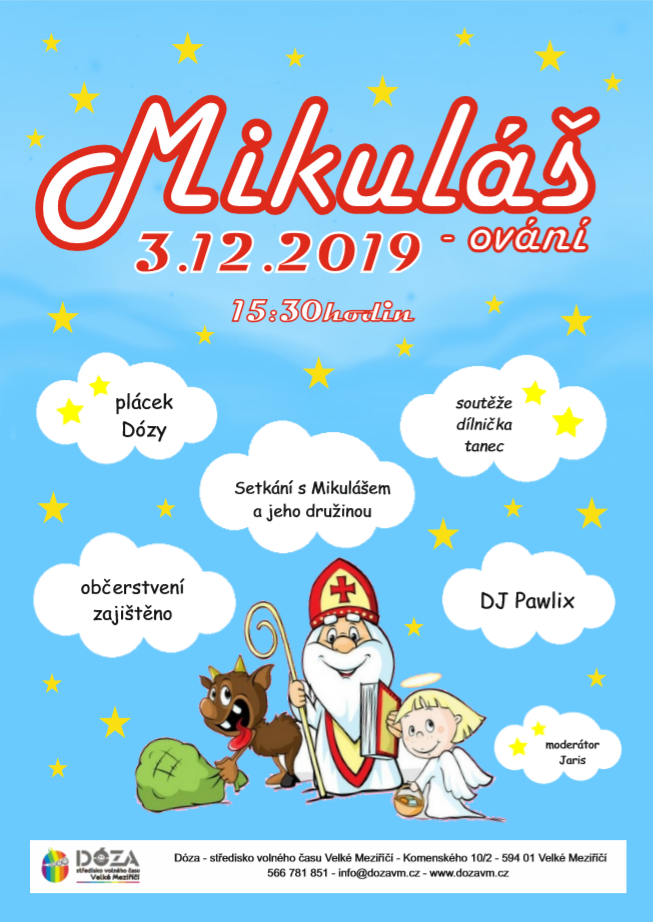 DÓZA SVČ zve všechny rodiče, děti a další rodinné příslušníky na předvánoční akci s názvem „MIKULÁŠování", která proběhne v úterý 3. prosince od 15.30 na plácku Dózy.