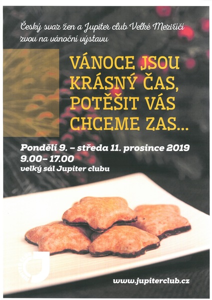 Svaz žen a Jupiter club vás srdečně zvou na již tradiční vánoční výstavu. Ve dnech od 9. do 11. prosince od 9 do 17 hodin můžete zhlédnout práce s vánoční a adventní tematikou, vánoční dekorace, ruční práce, perníčky, svíčky, a mnoho dalšího.