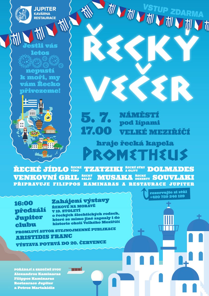 „Jestli vás letos nepustí k moři, my vám Řecko přivezeme." Velkomeziříčské náměstí provoní řecké jídlo a rozezní řecká hudba v podání kapely Prometheus. Výstava s názvem Řekové na Moravě v 19. století bude k nahlédnutí od 5. do 20. července v Jupiter clubu.