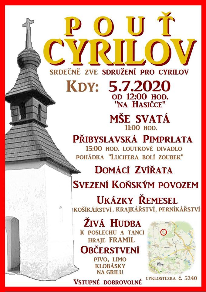 Sdružení obce Cyrilov vás srdečně zve na pouť s kulturním programem. Pouť zahájí mše svatá, po které následuje divadlo, svezení koňským povozem, živá hudba i ukázky řemesel.