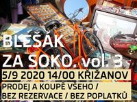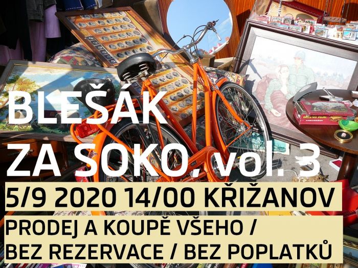 Blešák za soko, vol.3! Bez registrace. Bez poplatků. Prostě přijdete, prodáte, nakoupíte. Cokoliv. Za soko k tomu všemu bude domácí polévka, domácí limoška a určitě i něco sladkého. Za nepříznivého počasí akce neproběhne. Více info: tel. 608 075 617 / e-mail