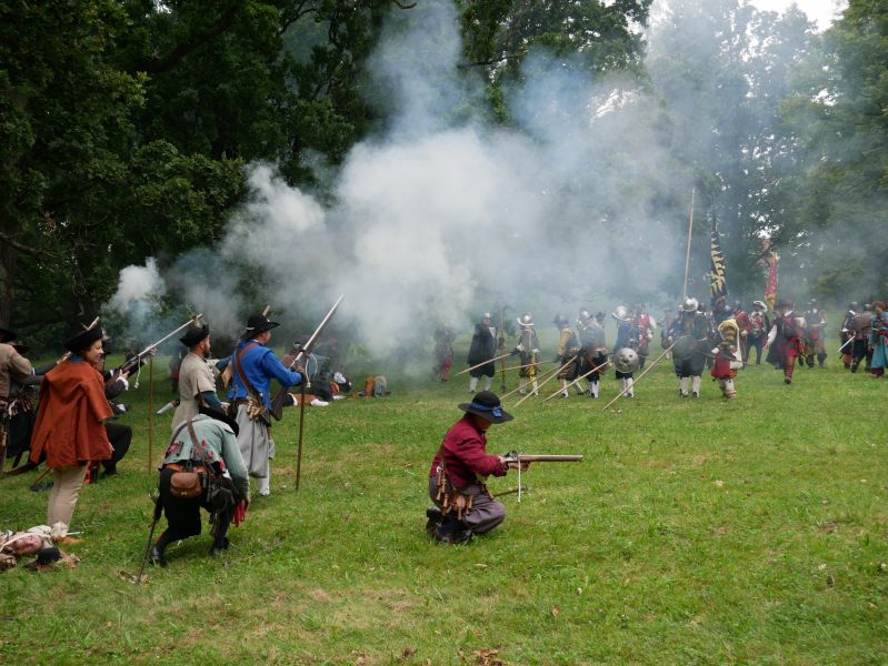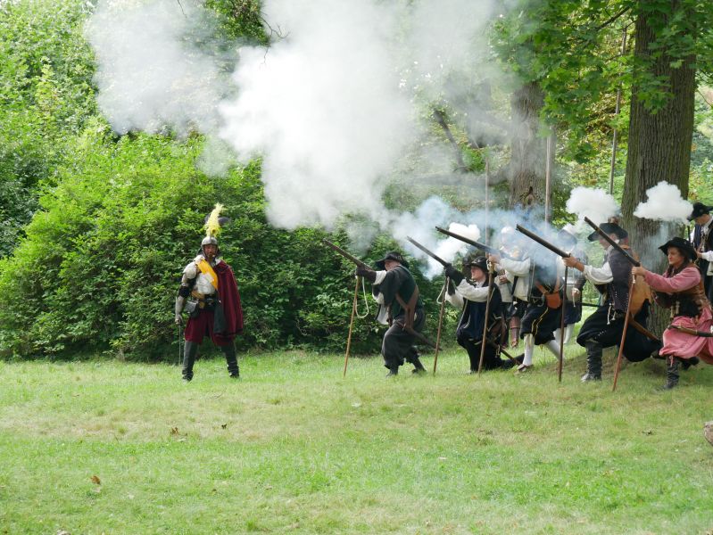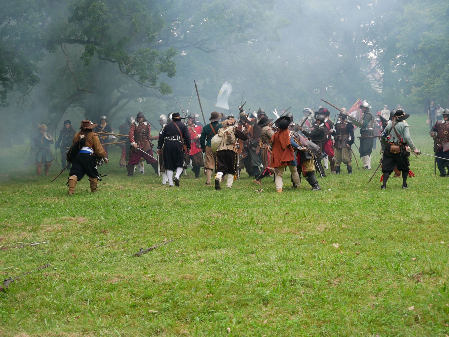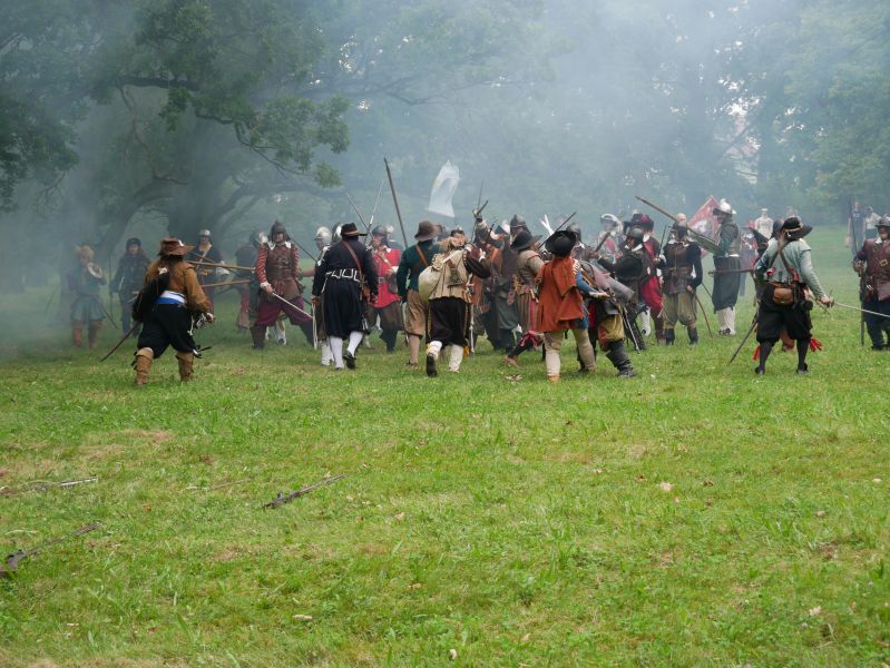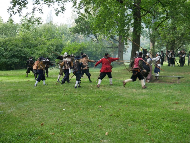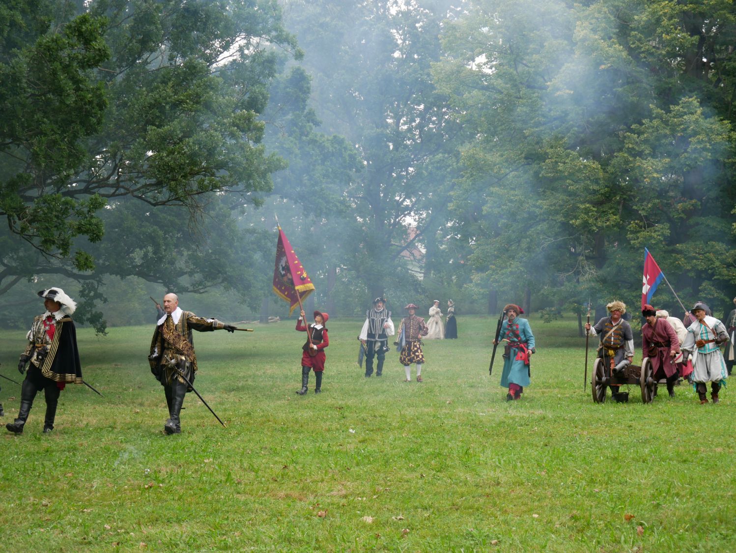 Výstřely, dým, vojáci i pikenýři, tak vypadala vojenská šarvátka v parku. Velkomeziříčská domobrana vzdorovala Švédům, kteří ale byli v přesile. Když už to vypadalo beznadějně, přišla meziříčským válečníkům na pomoc armáda pod vedením Albrechta z Valdštejna. Po ukrutném boji zachránila město od rabování a vypálení. Švédové museli uznat svoji porážku.