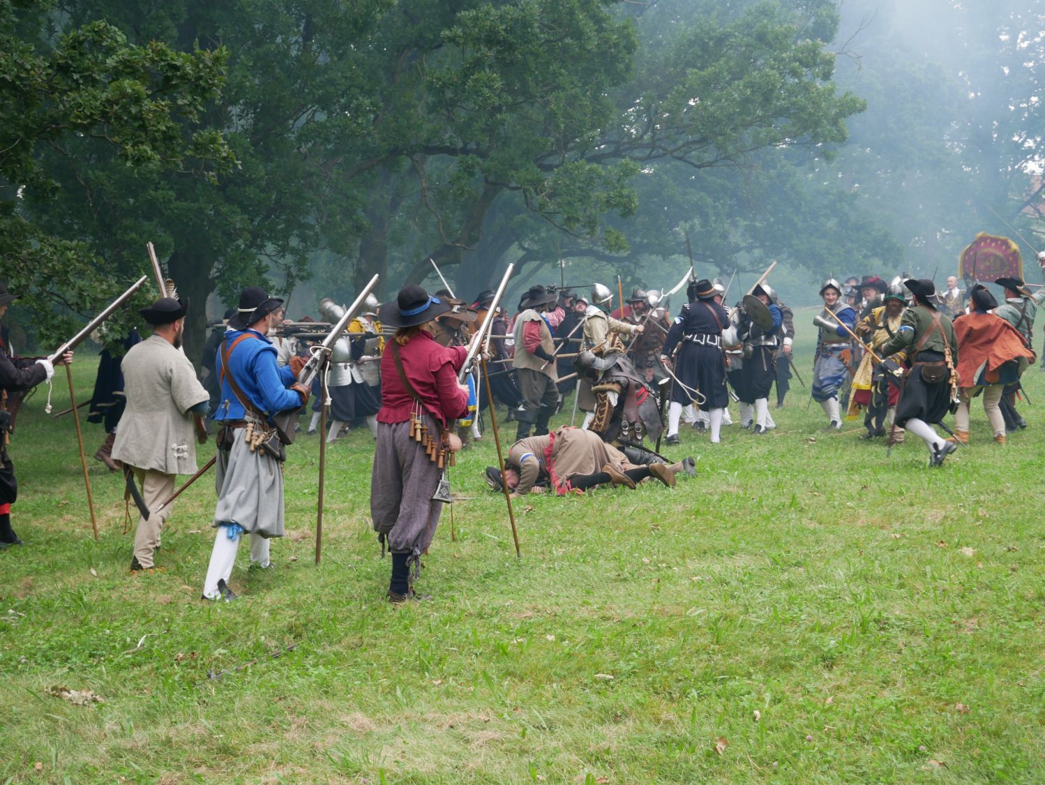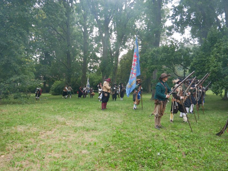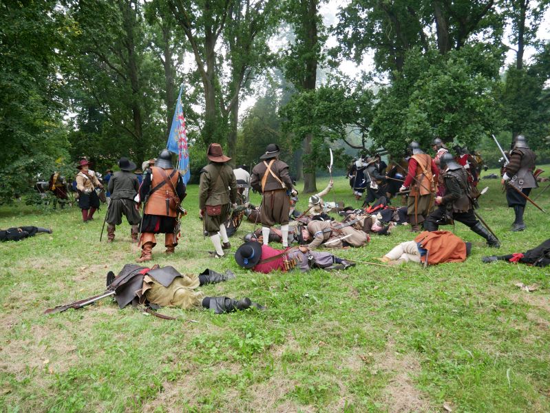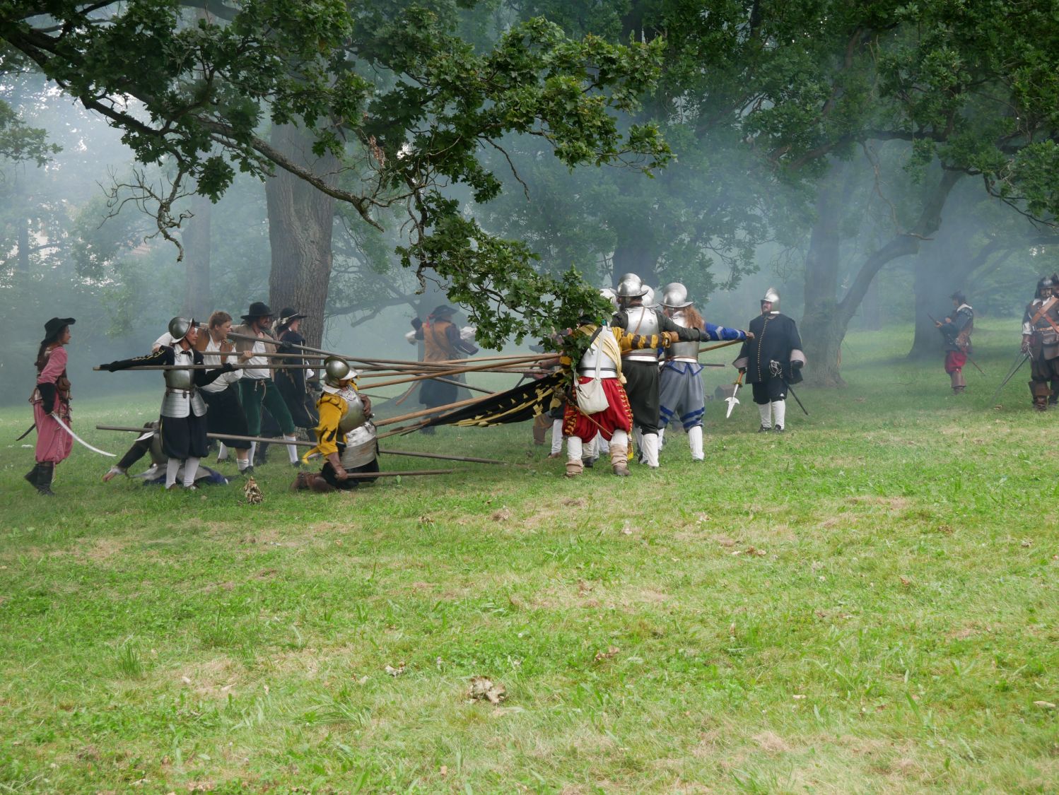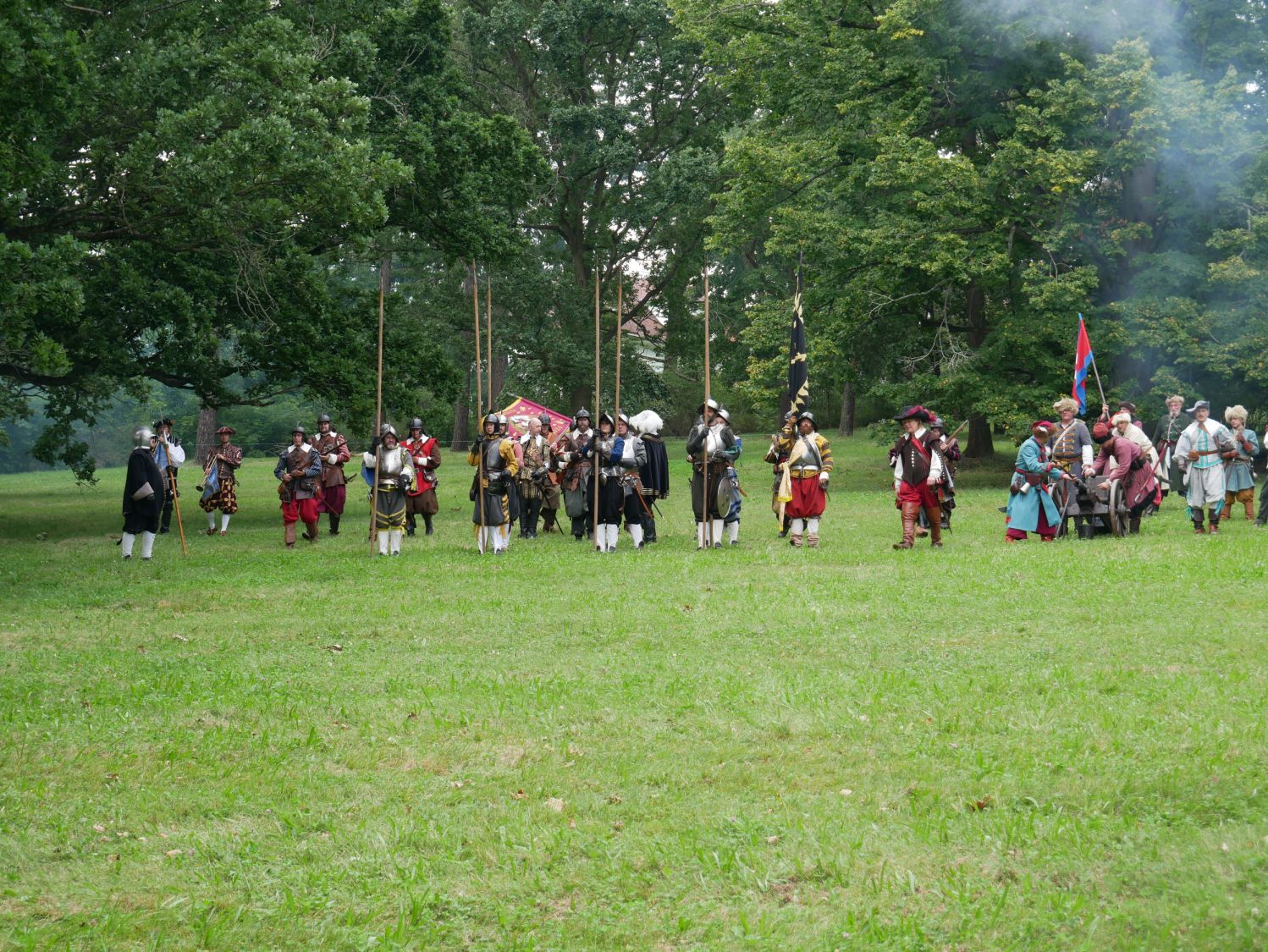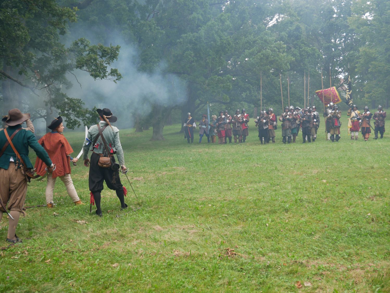 Výstřely, dým, vojáci i pikenýři, tak vypadala vojenská šarvátka v parku. Velkomeziříčská domobrana vzdorovala Švédům, kteří ale byli v přesile. Když už to vypadalo beznadějně, přišla meziříčským válečníkům na pomoc armáda pod vedením Albrechta z Valdštejna. Po ukrutném boji zachránila město od rabování a vypálení. Švédové museli uznat svoji porážku.