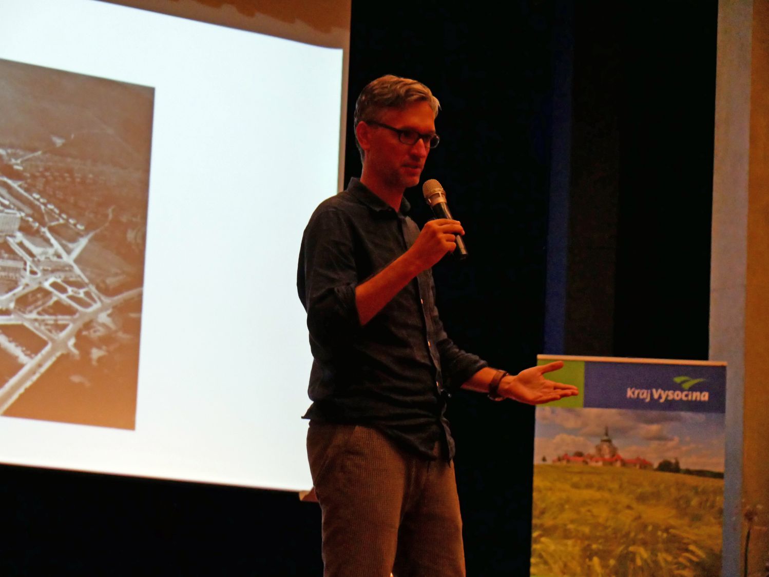 Prvním přednášejícím letošního ročníku festivalu se stal propagátor architektury Adam Gebrian, kterého přivítal na pódiu radní města Petr Velička.