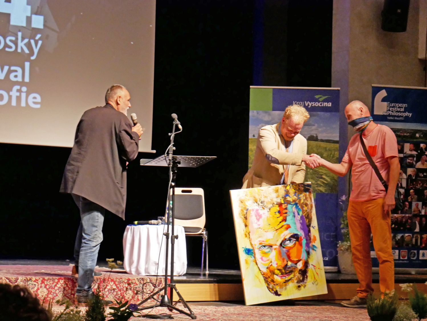 Jako dárek si Tomáš Sedláček odvezl obraz od Borka Vytlačila, který mu malíř předal společně s ředitelem festivalu.