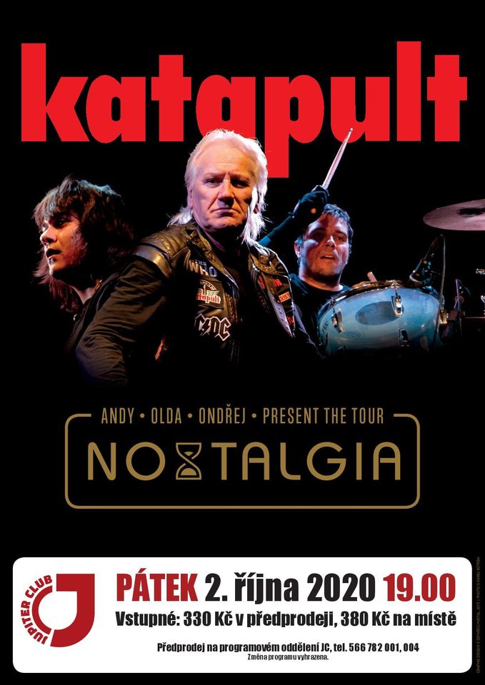 Skupina Katapult, která letos v srpnu oslavila 45 let od svého vzniku, přeložila svoje podzimní turné Nostalgia na příští rok. Kapela, jejíž turné plánované od poloviny března narušila pandemie nového typu koronaviru, se chce vrátit na koncertní pódia v době bez restrikcí, omezování a nařizování. Proto ve spolupráci s pořadateli přesula koncerty na období duben až listopad 2021. V Jupiter clubu Katapult odehraje dlouho plánovaný koncert 28. května. Zakoupené vstupenky zůstávají v platnosti.