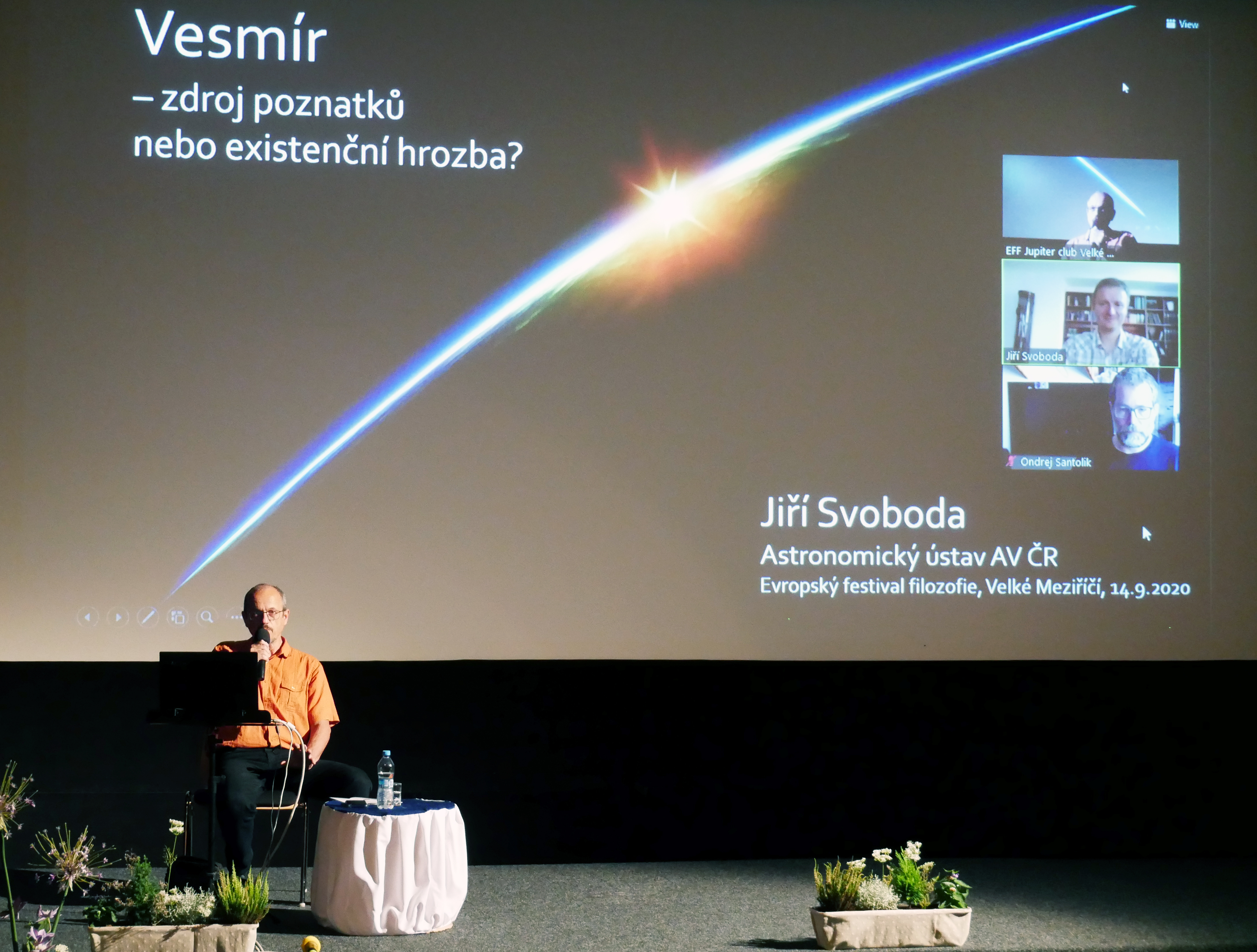 Evropský festival filozofie se na své pondělní přednášce 14. září zaměřil na téma vesmír. Je vesmír zdroj poznatků, nebo existenční hrozba? Na otázku odpovídal Jiří Svoboda z Astronomického ústavu Akademie věd ČR a Ondřej Santolík z Ústavu fyziky atmosféry Akademie věd. Moderátorem přednášek i následné diskuze se stal Josef Krob, profesor katedry filosofie Filozofické fakulty Masarykovy univerzity, která je odborným garantem festivalu. V úvodním slově specifikoval ředitel festivalu Milan Dufek průběh přednášky, která se vůbec poprvé odehrála formou videokonference.