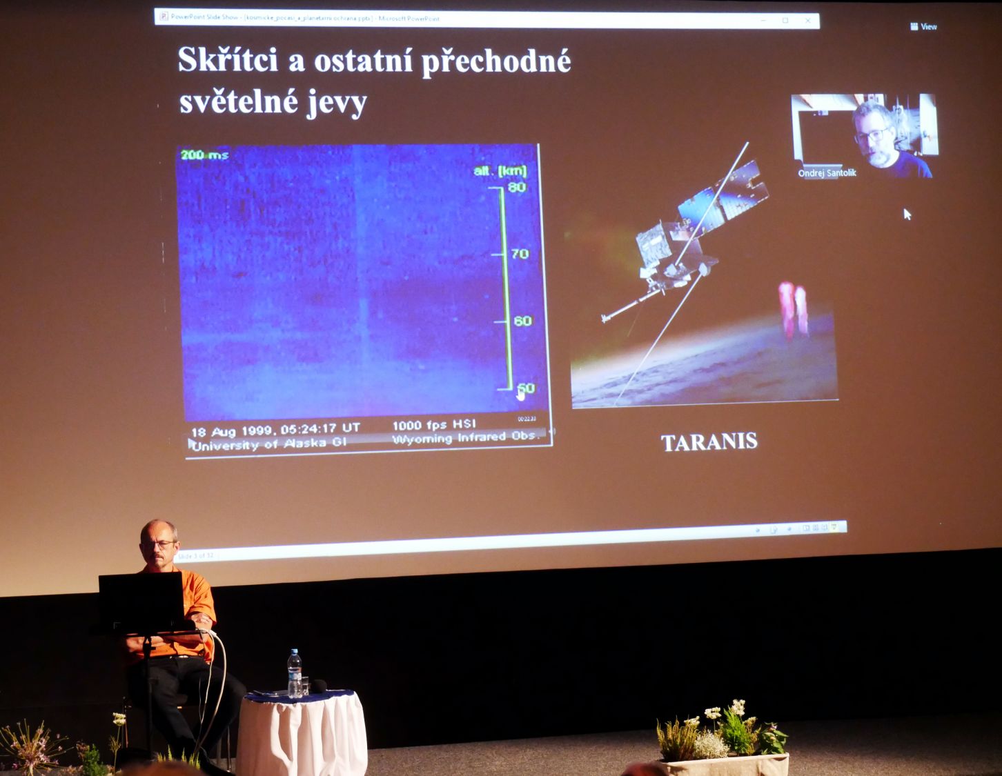 Profesor Santolík nejprve divákům pustil záhadný zvuk a nechal je hádat, co slyšeli. Tipy to byly vskutku zajímavé, kosmická bouře či zvuk vyšetření sonografem. „Jsou to rádiové vlny z bleskového výboje, které se odrážejí od ionosféry," nenechal Santolík diváky dlouho v napětí a tím odstartoval přednášku zaměřenou na kosmické počasí a planetární ochranu.