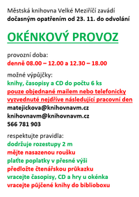 Chcete si půjčit knihu? V Městské knihovně Velké Meziříčí je to zase možné. Knihovna se přizpůsobila současné situaci a zavedla opět takzvaný okénkový provoz, na jehož základě vám může bezpečnějším způsobem půjčit předem objednanou knihu, časopis i CD až do výše šesti kusů. Čtenáři si po předchozím objednání mohou knihy vypůjčit od pondělí 23. listopadu, výdej bude probíhat každý den od 8 do 12 hodin a od 12:30 do 18 hodin.