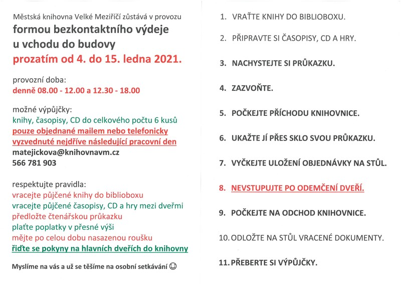 Chcete si půjčit knihu? V Městské knihovně Velké Meziříčí je to zase možné. Knihovna se přizpůsobila současné situaci a zavedla opět takzvaný okénkový provoz, na jehož základě vám může bezpečnějším způsobem půjčit předem objednanou knihu, časopis i CD až do výše šesti kusů. Čtenáři si po předchozím objednání mohou knihy vypůjčit od pondělí 4. listopadu prozatím do pátku 15. ledna, výdej bude probíhat každý den od 8 do 12 hodin a od 12:30 do 18 hodin.