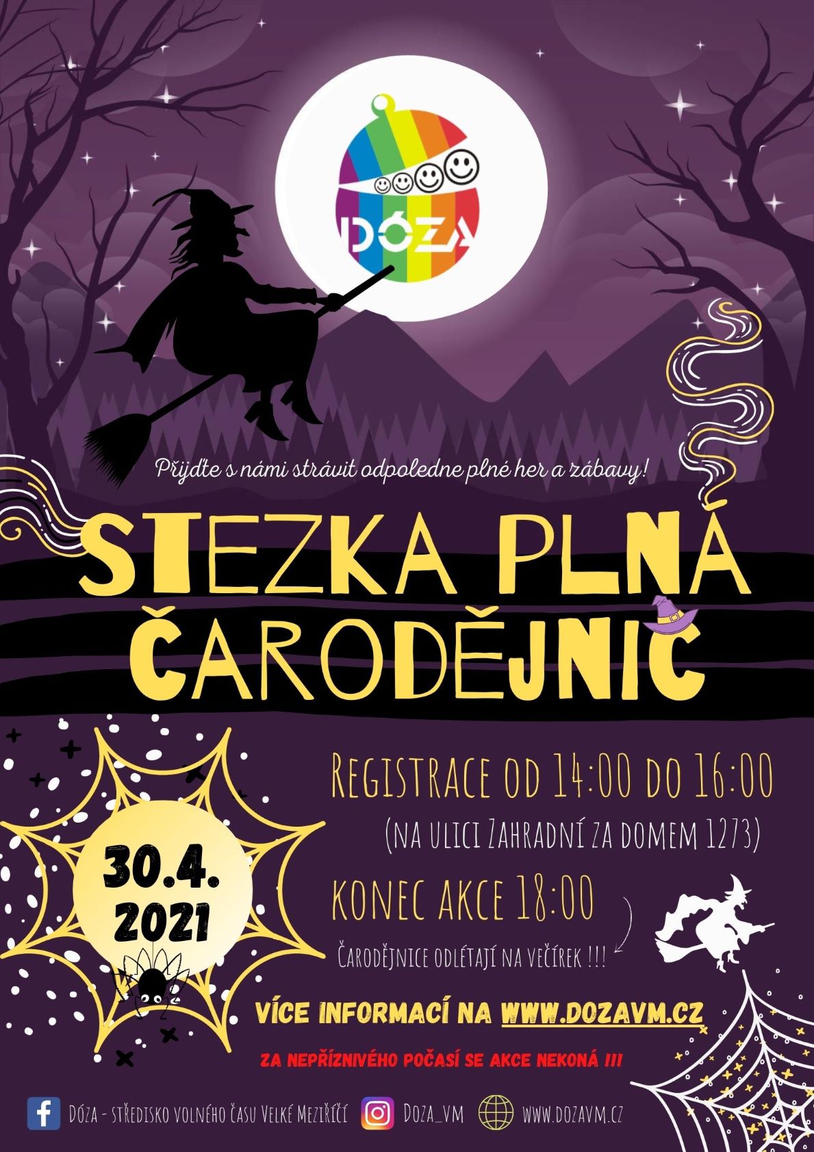 Dnes odpoledne v Meziříčí v ulici Zahradní za domem 1273, pokud počasí dovolí, proběhne odpoledne plné zajímavých úkolů. Za pracovnicemi Dózy přiletí čarodějnice. Registrovat se můžete od 14 do 16 hodin, program pracovnice Dózy sladily s odletem čarodějnic do 18 hodin. Vstup je zdarma, tak neváhejte a užijte si procházku stezkou plnou her a zábavy.