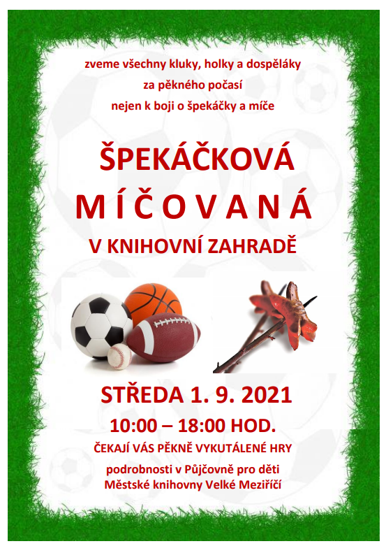 Ve středu 1. září bude ve velkomeziříčské městské knihovně plně otevřena jen půjčovna pro dospělé. Lepší zvěstí je, že po letním krácení již v plné provozní době, tedy od 7.30 do 18.00. A vyloženě výbornou zprávou je pozvání do naší zahrady! Úderem desáté dopolední a šesté podvečerní jsme vymezili čas, kdy bude pro všechny kluky, holky a dospěláky, kteří se chtějí rozloučit s prázdninami, nachystána ŠPEKÁČKOVÁ MÍČOVANÁ.