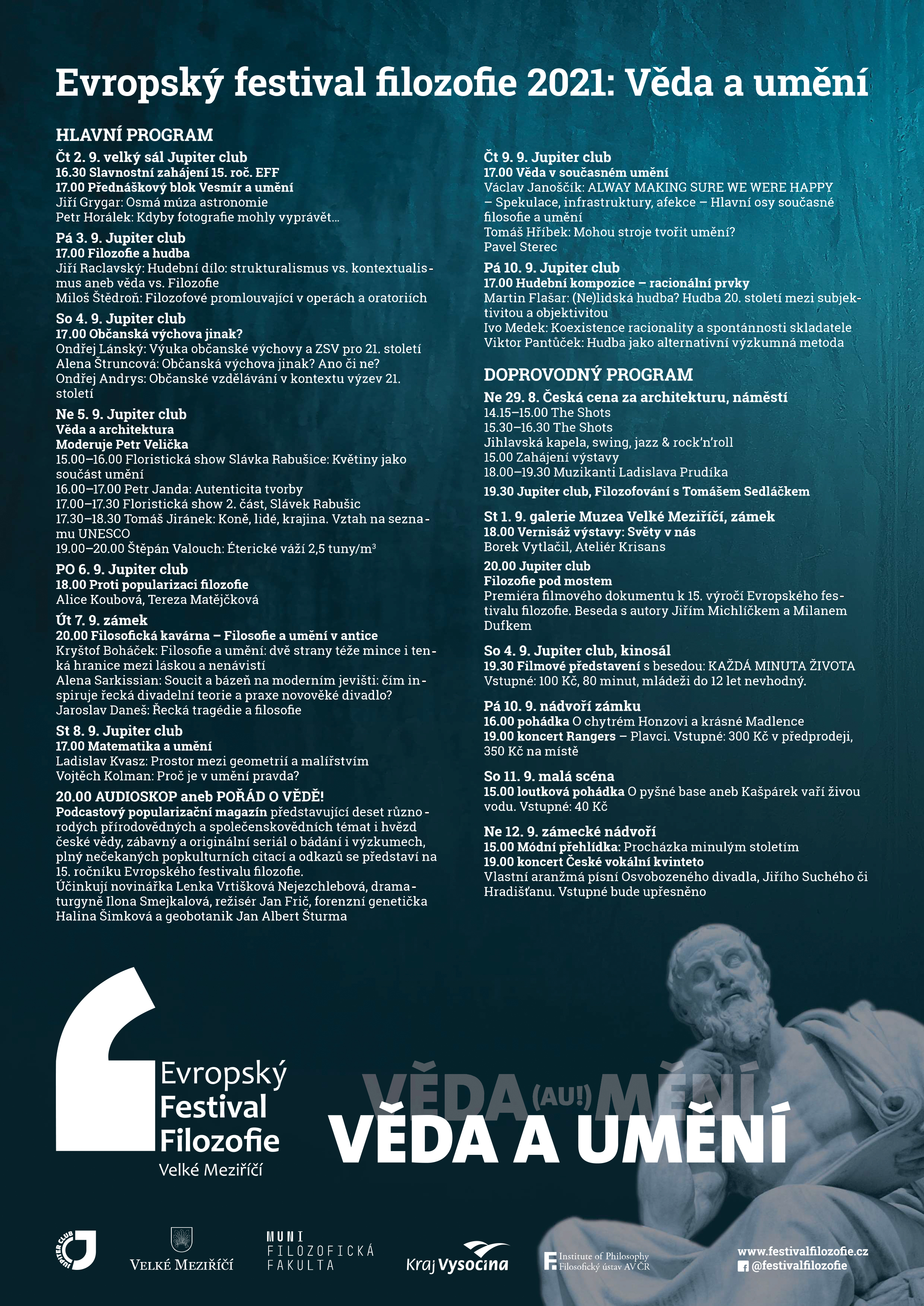 Loňský zahajovací večer slibovali organizátoři volbu pozitivního tématu napřesrok, jelikož se v posledních letech dařilo až podezřele vystihnout jeho aktuálnost. Hrozby a příležitosti tak vystřídala Věda a umění. Patnáctý ročník Evropského festivalu filozofie, který se koná tradičně v Meziříčí, startuje 29. srpna a až do 12. září láká na přednášky, vernisáž, filmové představení, módní přehlídku, pohádky a koncerty. I v letošním roce povedou přednášky renomovaní odborníci ve svém oboru. „Na festivalu v minulosti vystoupilo téměř 290 přednášejících. Z toho 46 profesorů a 34 docentů, dva bývalí předsedové vlády ČR a SR. Přivítali jsme i spoustu známých tváří z kulturního a společenského života," shrnul Milan Dufek, ředitel festivalu. Zvučná jména i okruhy filozofických témat si můžete přečíst na plakátu.