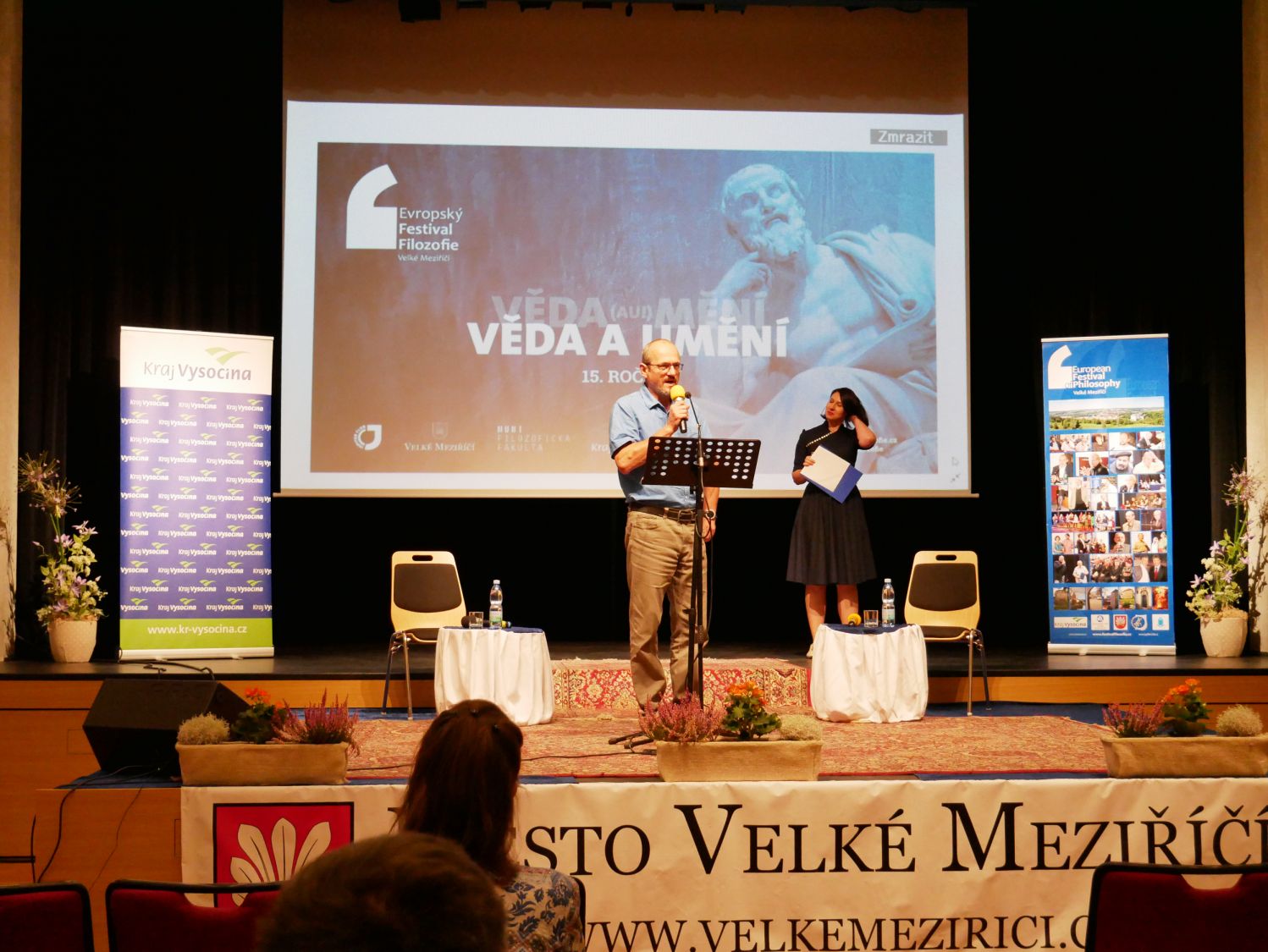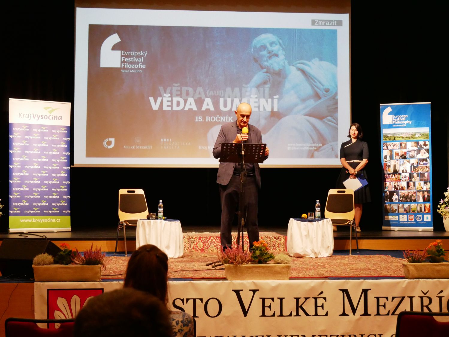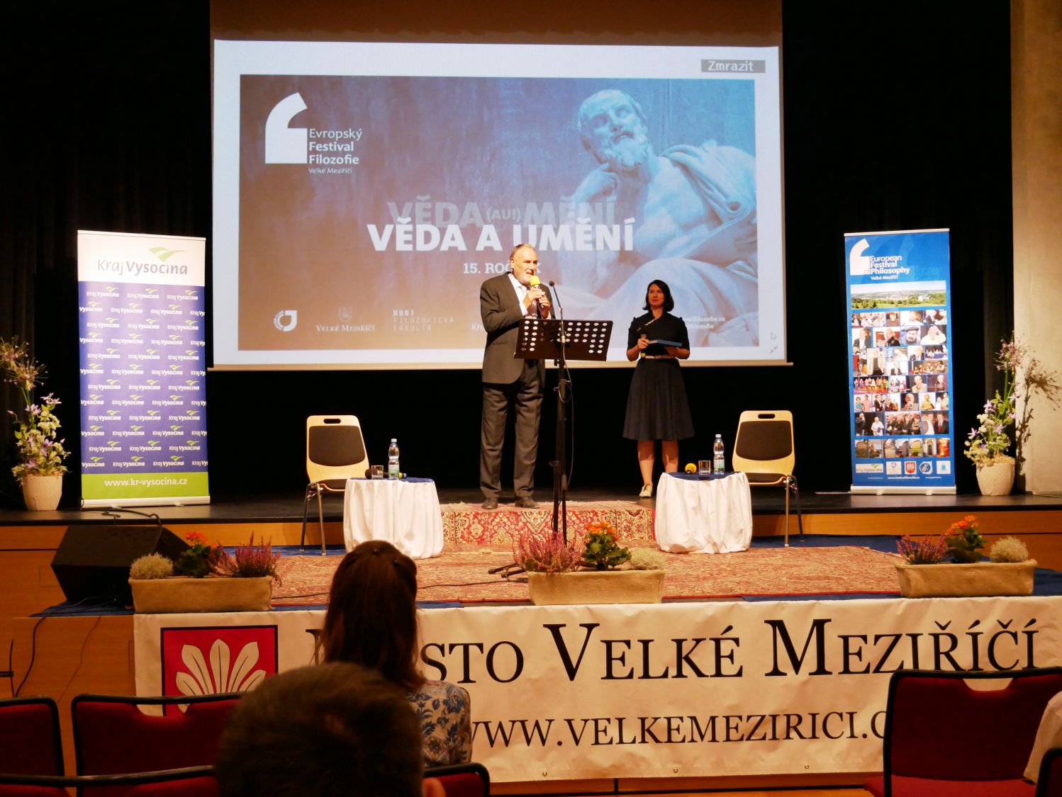 Slavnostního zahájení patnáctého ročníku Evropského festivalu filozofie se ujal nejpovolanější ze všech, jeho ředitel Milan Dufek. Na pódiu postupně vystoupilo šest řečníků. Starosta města Alexandros Kaminaras oceňoval, jakou ojedinělou událost může hostit právě naše město. Ředitel Filosofického ústavu Akademie věd ČR, Ondřej Ševeček, vzpomenul kolegy, kteří se už události zúčastnit nemohou. Jmenoval zejména váženého Erazima Koháka a Ivana Havla. Náměstek hejtmana Kraje Vysočina, Vladimír Novotný, ocenil živé publikum. Předseda Akademie věd ČR, Pavel Baran, děkoval městu i Milanu Dufkovi a apeloval na pokračování unikátního festivalu v dalších letech. „ Já vám předvedu umění nezdržovat. Příjemně se bavte," rozesmál publik profesor Masarykovy univerzity, Josef Krob. V závěru zahajovací části se sešli všichni řečníci na pódiu, aby pokřtili knihu Milana Dufka s názvem Filozofie pod mostem. Ta je k zakoupení za 395 korun.