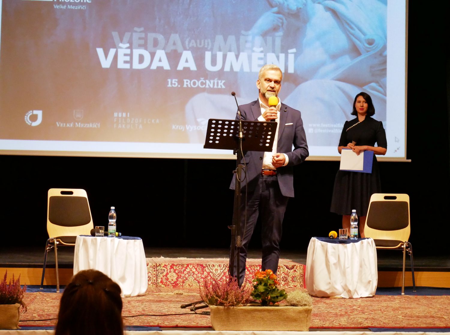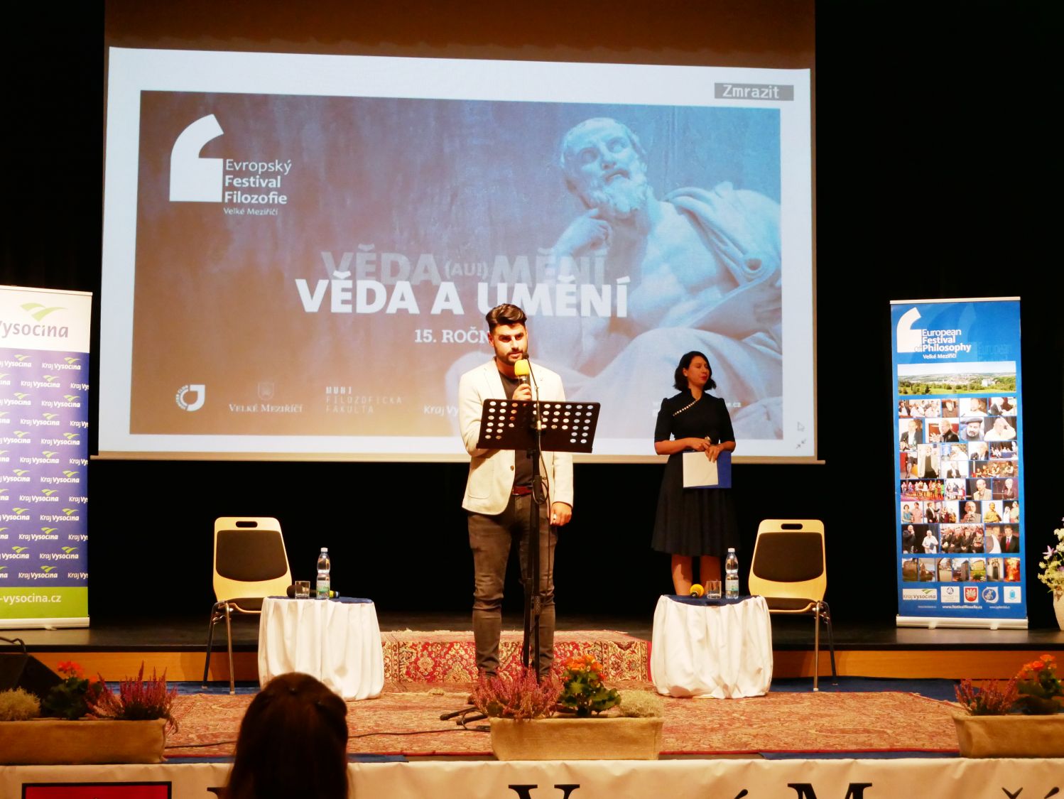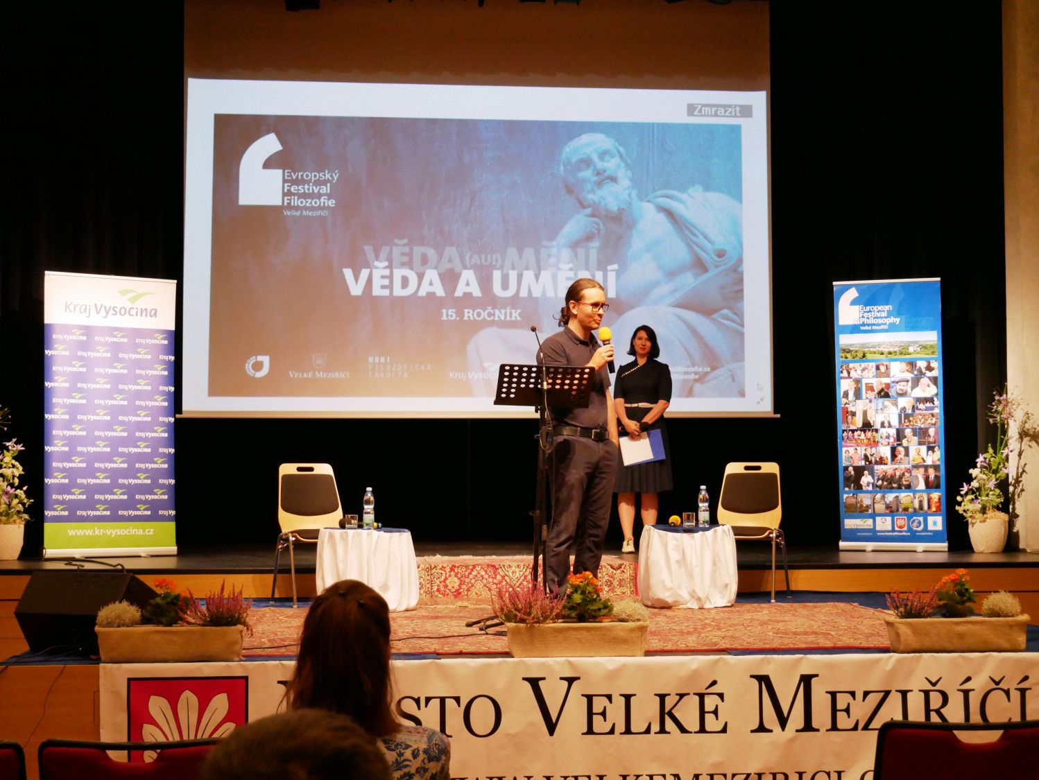 Slavnostního zahájení patnáctého ročníku Evropského festivalu filozofie se ujal nejpovolanější ze všech, jeho ředitel Milan Dufek. Na pódiu postupně vystoupilo šest řečníků. Starosta města Alexandros Kaminaras oceňoval, jakou ojedinělou událost může hostit právě naše město. Ředitel Filosofického ústavu Akademie věd ČR, Ondřej Ševeček, vzpomenul kolegy, kteří se už události zúčastnit nemohou. Jmenoval zejména váženého Erazima Koháka a Ivana Havla. Náměstek hejtmana Kraje Vysočina, Vladimír Novotný, ocenil živé publikum. Předseda Akademie věd ČR, Pavel Baran, děkoval městu i Milanu Dufkovi a apeloval na pokračování unikátního festivalu v dalších letech. „ Já vám předvedu umění nezdržovat. Příjemně se bavte," rozesmál publik profesor Masarykovy univerzity, Josef Krob. V závěru zahajovací části se sešli všichni řečníci na pódiu, aby pokřtili knihu Milana Dufka s názvem Filozofie pod mostem. Ta je k zakoupení za 395 korun.