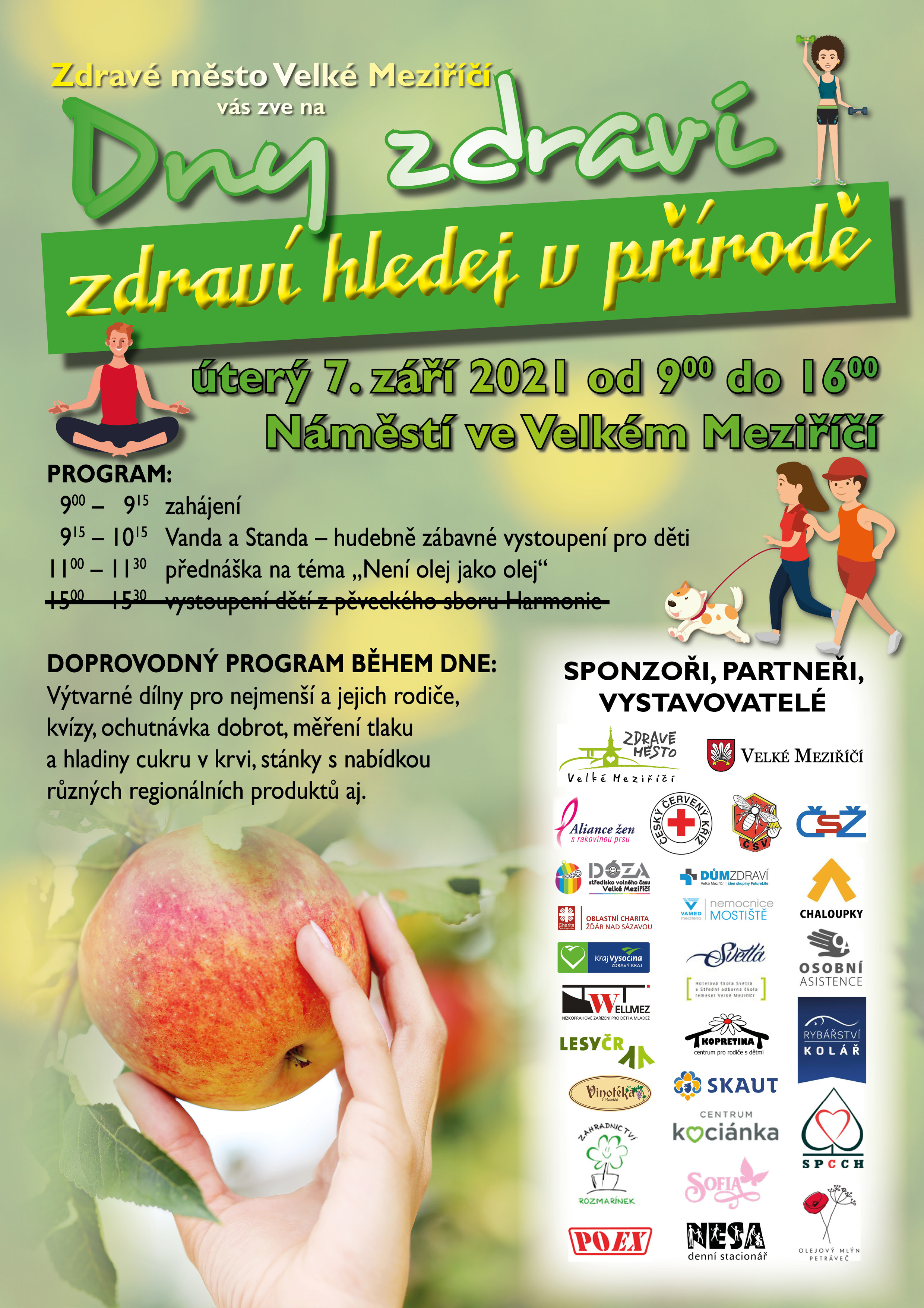 Výtvarné dílny, kvízy, ochutnávky dobrot, stánky, měření tlaku a hladiny cukru v krvi. To všechno nabídnou Dny zdraví na velkomeziříčském Náměstí v úterý 7. září. Pořadatelé ze Zdravého města Velké Meziříčí připravili nabitý program pro všechny věkové kategorie. V dopoledních hodinách vystoupí na podiu Vanda a Standa se svým hudebně zábavným představením pro děti, před polednem si můžete poslechnout přednášku na téma Není olej jako olej. Změna nastává pouze odpoledne, protože děti z pěveckého sboru Harmonie bohužel nezazpívají.