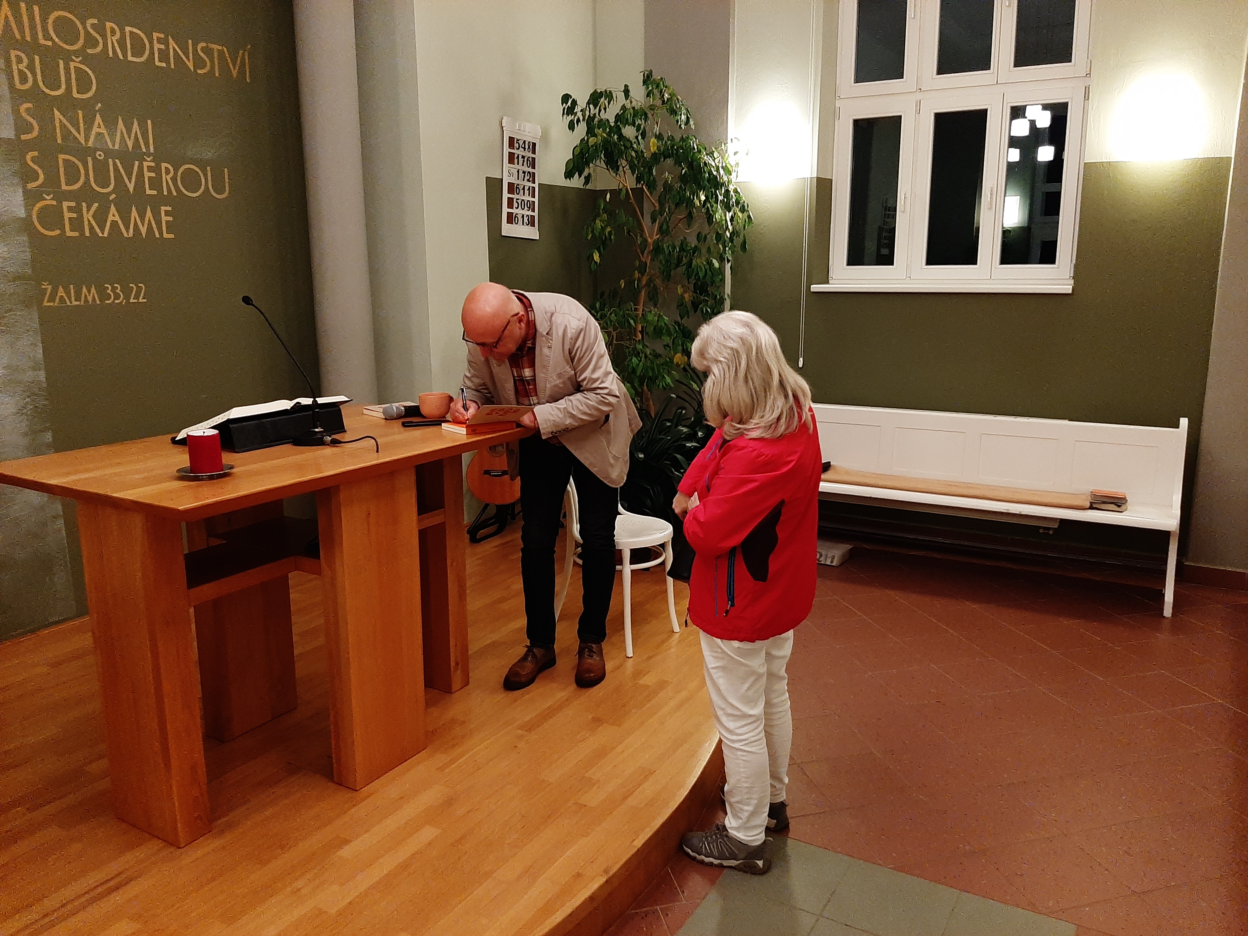 Celý večer s Alexandrem Sašou Flekem byl jedno velké svědectví o tom, jak autenticky převyprávěný příběh Ježíše Krista vzbuzuje víru, důvěru, lásku a naději. Večer jsme uzavřeli nákupem knih a neformálním rozhovorem u večeře. Všichni přítomní k ní byli pozváni – v duchu evangelijní tradice.