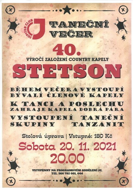 Hudební událost meziříčské country kapely Stetson, pořádaná u příležitosti 40. výročí od založení, se z důvodu onemocnění jednoho z členů ruší. Nový náhradní termín prozatím není známý. Akce se měla konat tuto sobotu 20. listopadu v 20:00 hodin ve velkém sále Jupiter clubu.