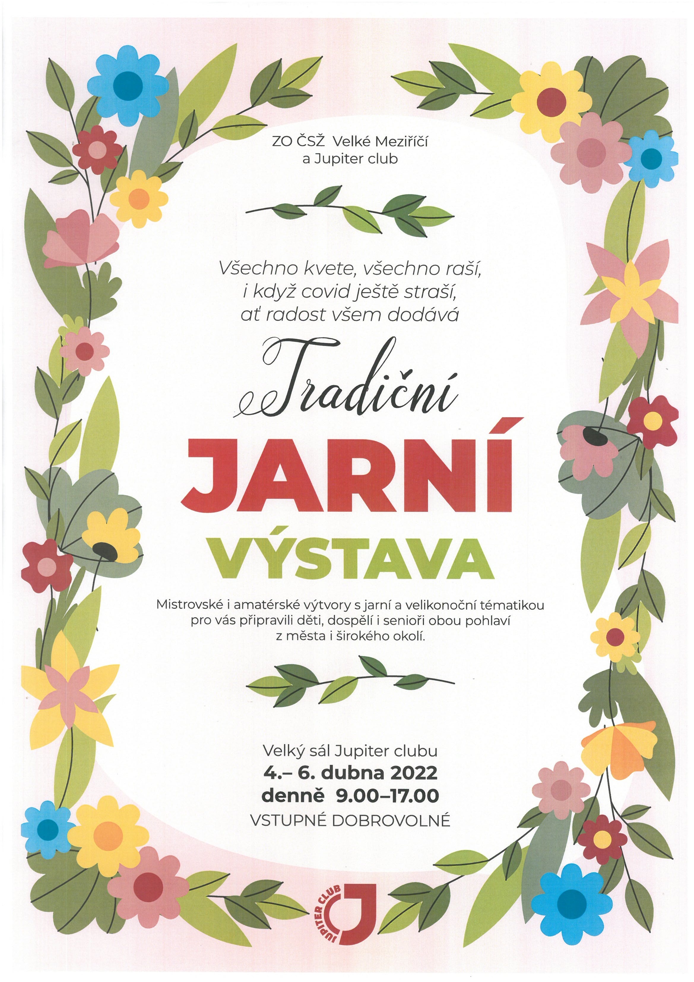 Od pondělí 4. dubna vypukne v prostorách Jupiter clubu jarní výstava, která potrvá až do středy 6. dubna. Otevřená bude vždy v čase od 9:00 do 17:00 hodin. Výstava se uskuteční ve velkém sálu Jupiter clubu. Veškeré vystavované výtvory jsou prací dětí, dospělých i seniorů z města Velkého Meziříčí i širokého okolí. Vstupné je dobrovolné.