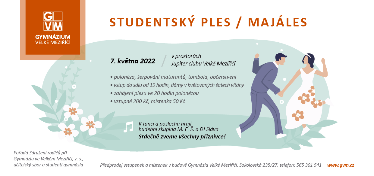 V sobotu 7. května se v prostorách Jupiter clubu uskuteční studentský ples. Sál své dveře návštěvníkům otevře v 19:00 hodin. Oficiálně ples zahájí tanečníci polonézou ve 20 hodin. K tanci zahraje skupina M.E.Š. a DJ Sláva.