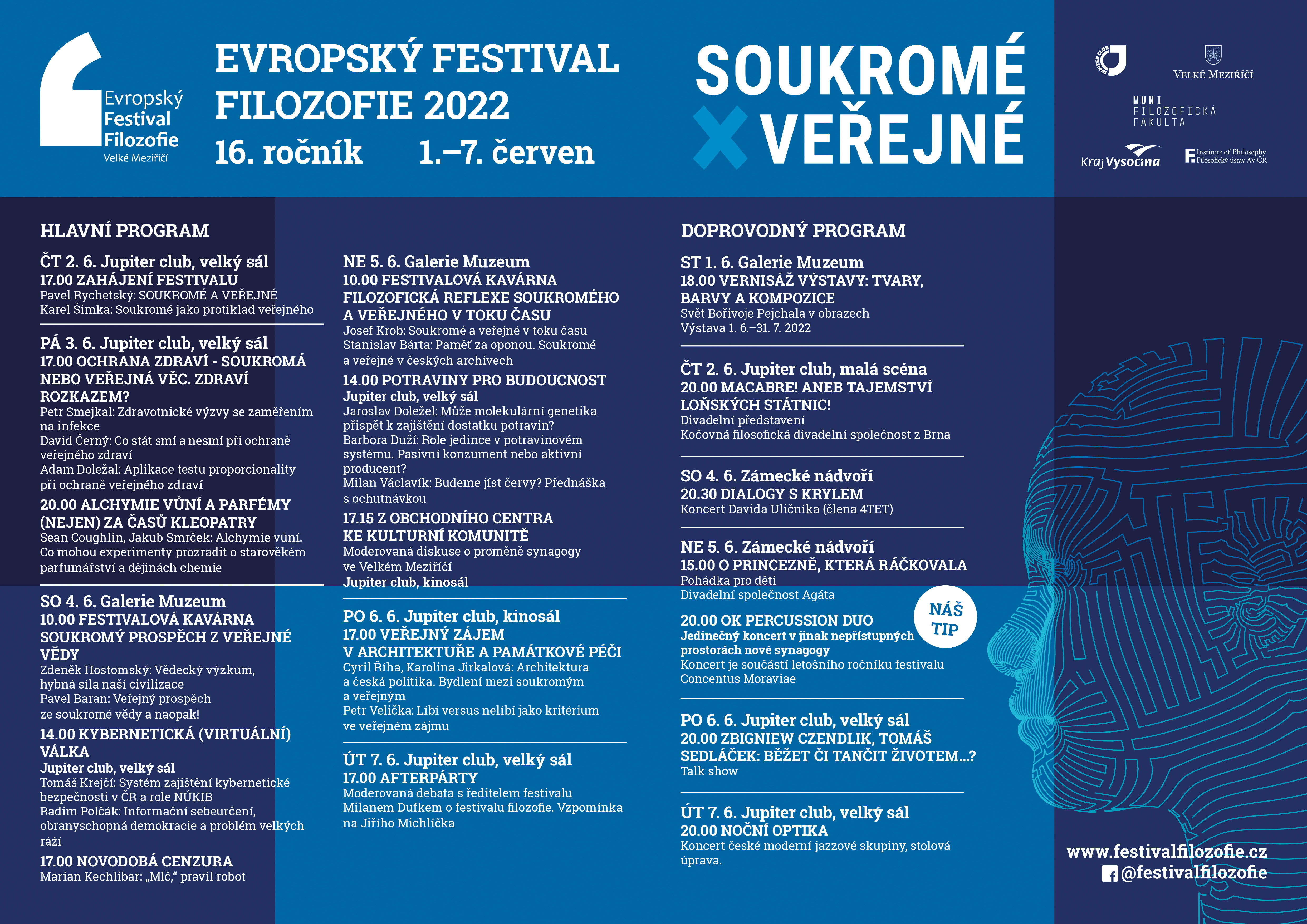 Evropský festival filozofie startuje ve středeční podvečer vernisáží výstavy Bořivoje Pejchala: Tvary, barvy a kompozice. Ve čtvrtek v 17 hodin se na vás těší významní hosté, kteří v Jupiter clubu slavnostně zahájí přednáškový blok s plejádou zajímavých osobností. Na ně rovnou naváže první přednáška na téma Soukromé a veřejné, které se zhostí známý politik a právník Pavel Rychetský a předseda Nejvyššího správního soudu ČR Karel Šimka.