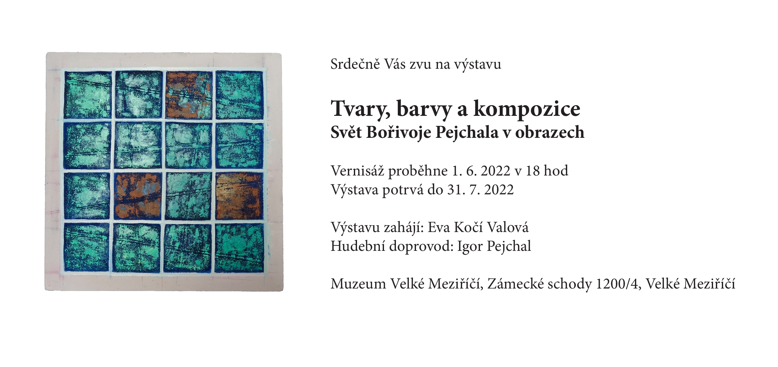 Na příchozí čekají desítky obrazů velkomeziříčského výtvarníka Bořivoje Pejchala, jehož výstava „Tvary, barvy a kompozice – Svět Bořivoje Pejchala v obrazech", bude slavnostně zahájena ve středu 1. června v 18 hodin. Úvodní slovo pronese Eva Kočí Valová, o hudební doprovod se postará Igor Pejchal.