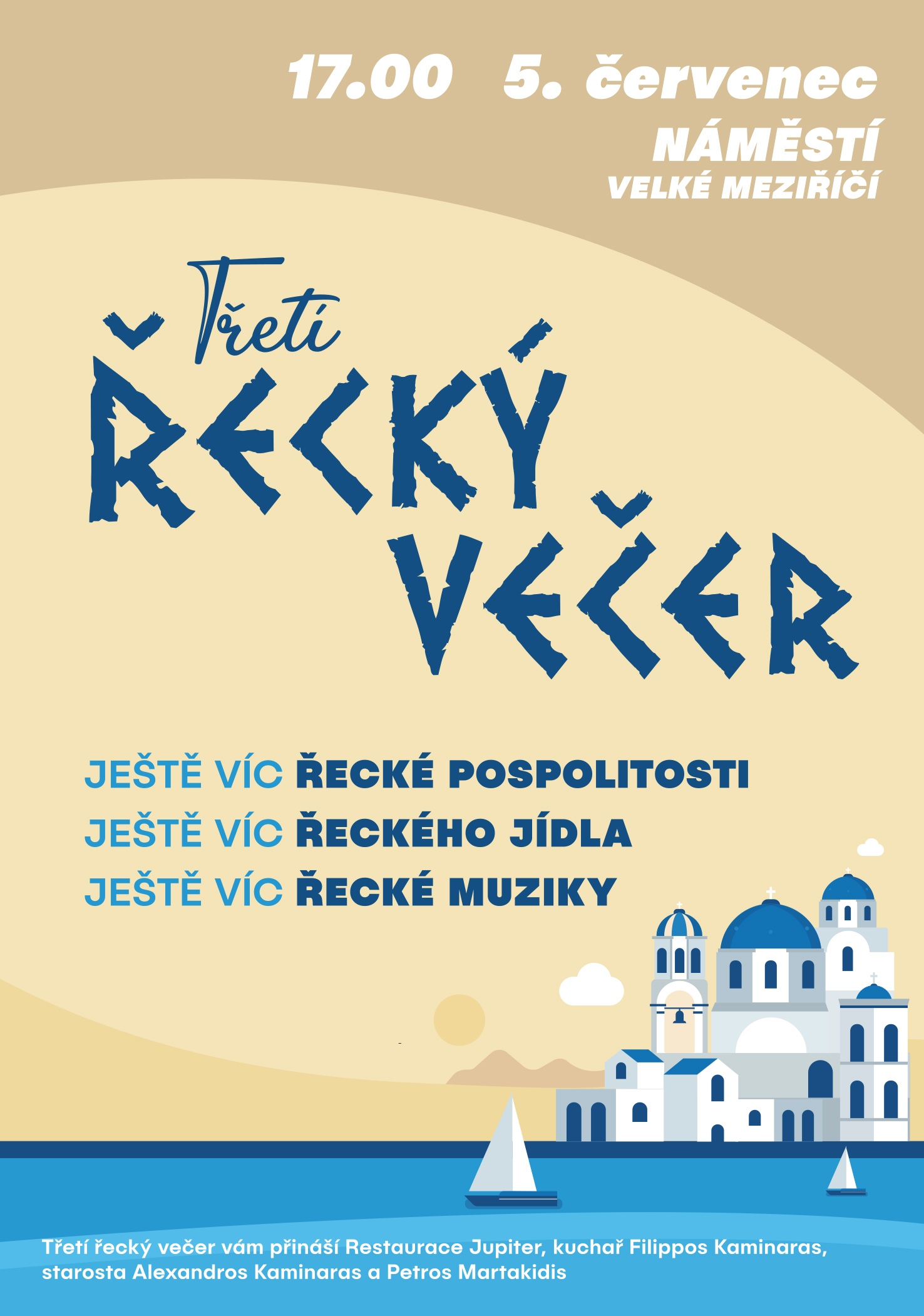 V úterý 5. července se na náměstí v prostoru pod lípami odehraje již třetí Řecký večer. Ten návštěvníky přenese na slunný jih Evropy a nabídne jim ještě více řecké pospolitosti, hudby a středomořských pochutin než v uplynulých letech.