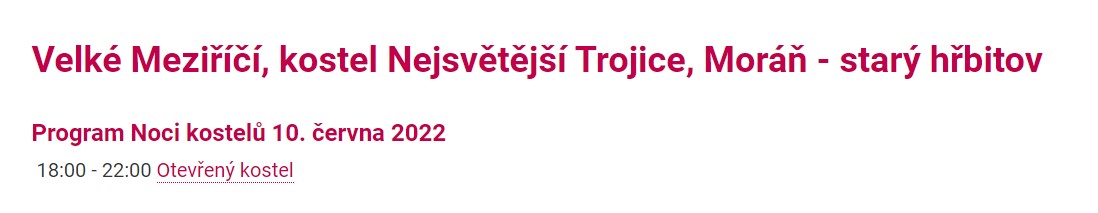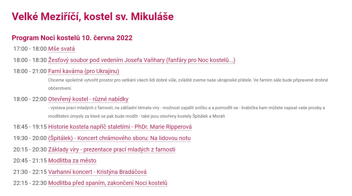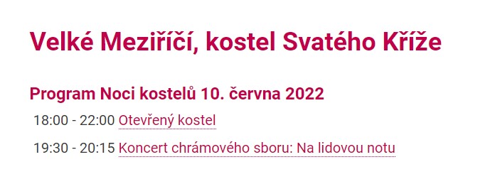 V pátek 10. června se uskuteční Noc kostelů, do které se zapojily i 3 kostely v našem městě. Mši, koncert nebo modlitbu si můžete poslechnout v kostele svatého Mikuláše, kostele svatého Kříže či v kostele Nejsvětější Trojice. Všechna tato místa se nachází v blízkosti velkomeziříčského náměstí, tudíž je jednoduché cestovat z jednoho místa na druhé.